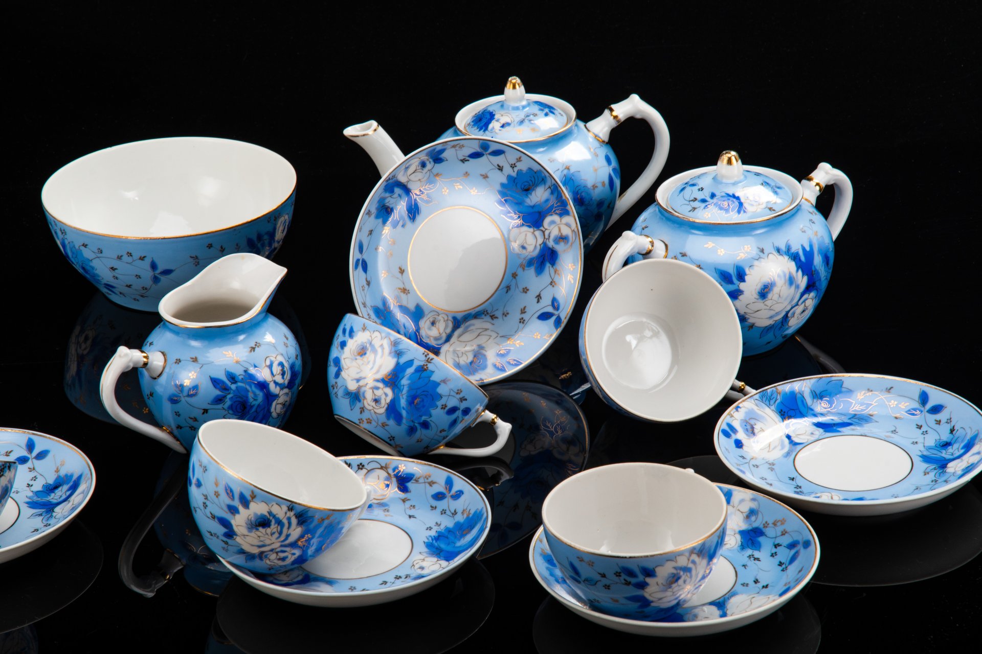 Сервиз чайный с цветочным декором на 4 персоны (15 предметов), фарфор, роспись, люстр, золочение, Дулевский фарфоровый завод (Дулёво), Россия, 1989 г.