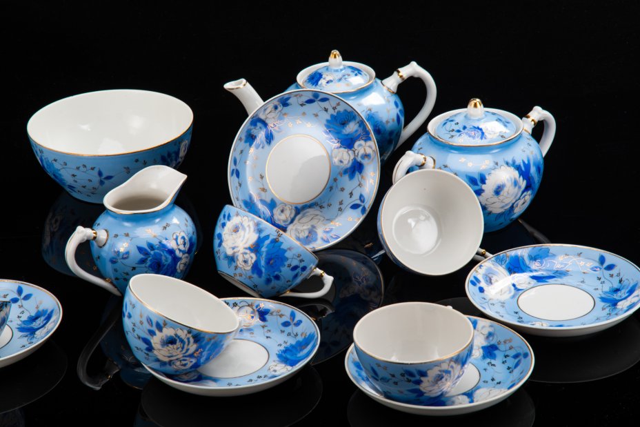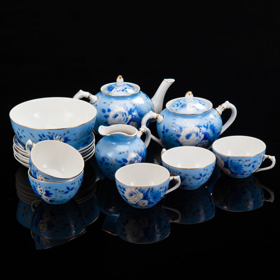 Сервиз чайный на 5 персон, украшенный цветочным декором (18 предметов) форма "Белый лебедь", автор формы О.М. Мухигули, фарфор, деколь, золочение, Дулевский фарфоровый завод (Дулёво), Российская Федерация, 1991 г.