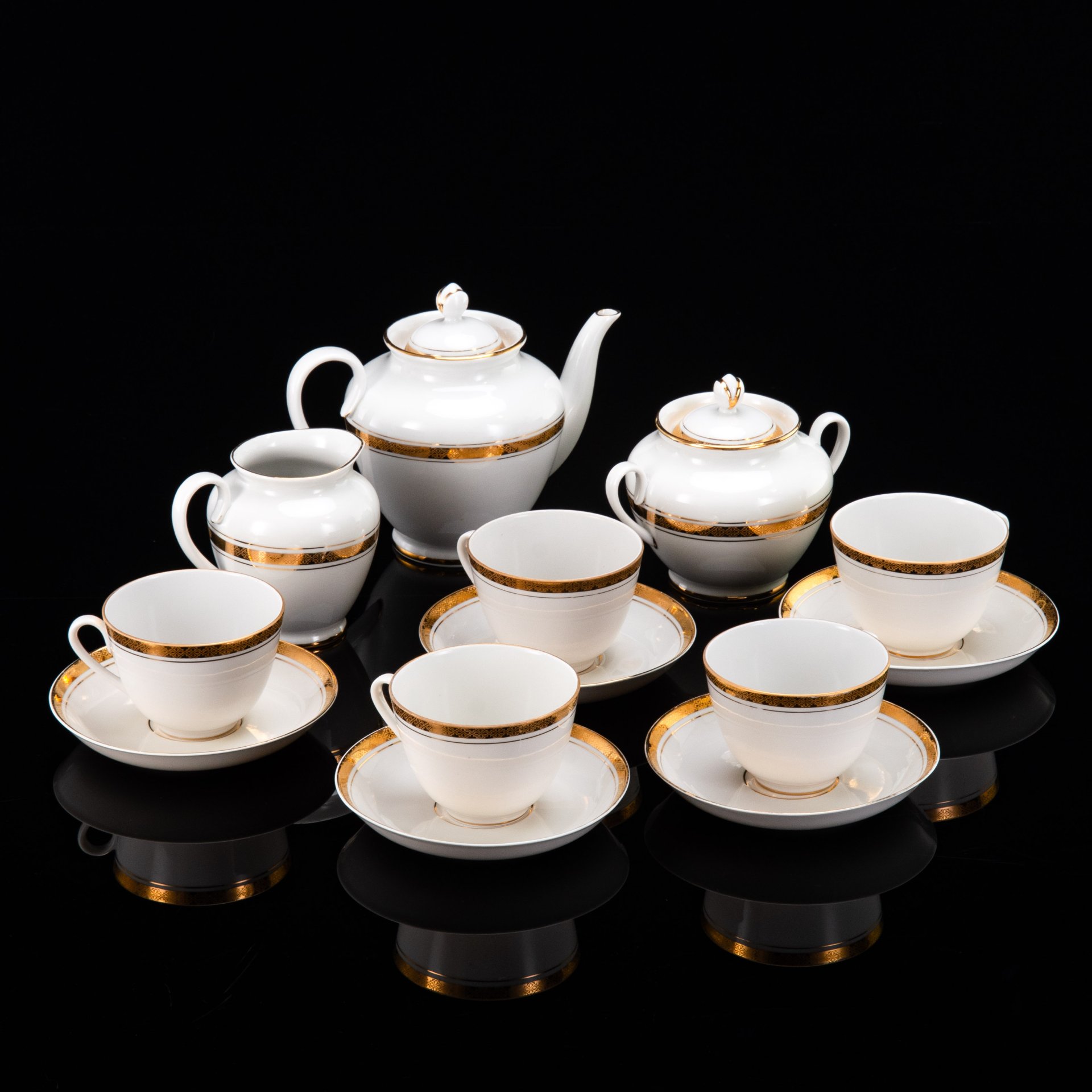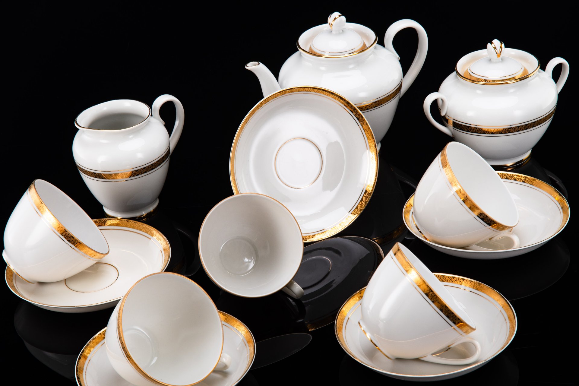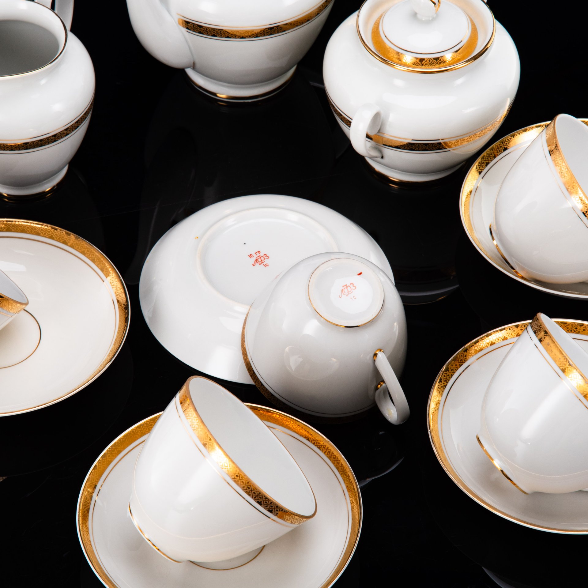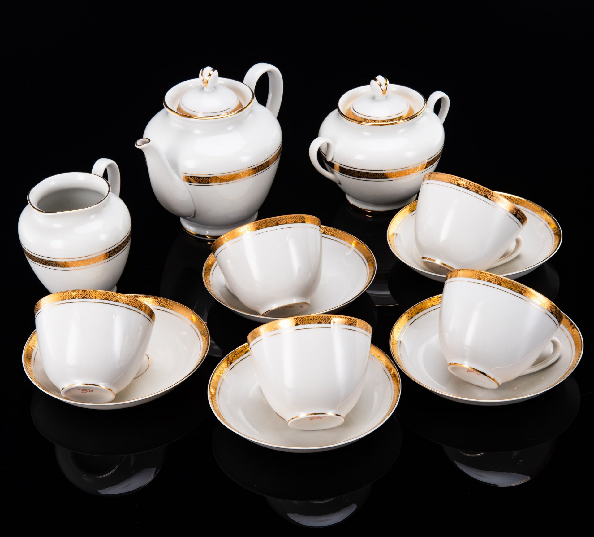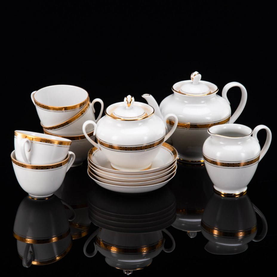 Сервиз чайный со стилизованным цветочным декором на 5 персон (19 предметов), завод "Lubiana", фарфор, деколь, золочение, Польша, 1966-1994 гг.