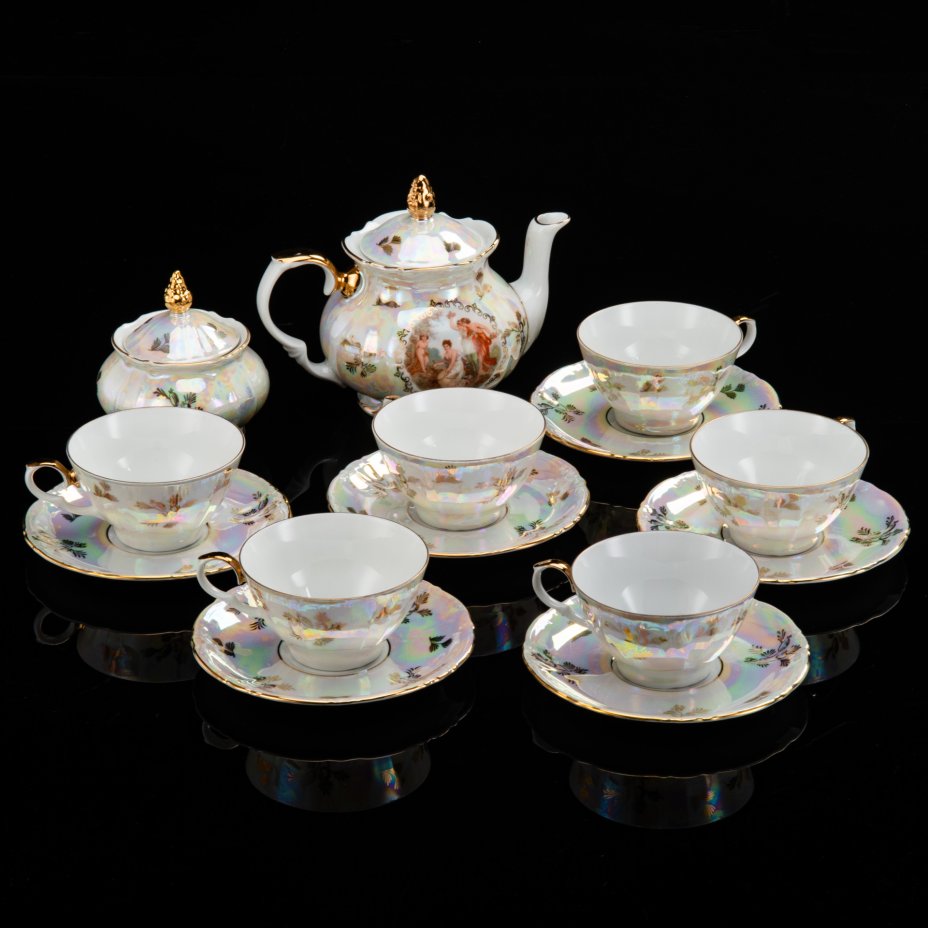 Сервиз чайный с цветочным декором на 4 персоны (15 предметов), фарфор, роспись, люстр, золочение, Дулевский фарфоровый завод (Дулёво), Россия, 1989 г.