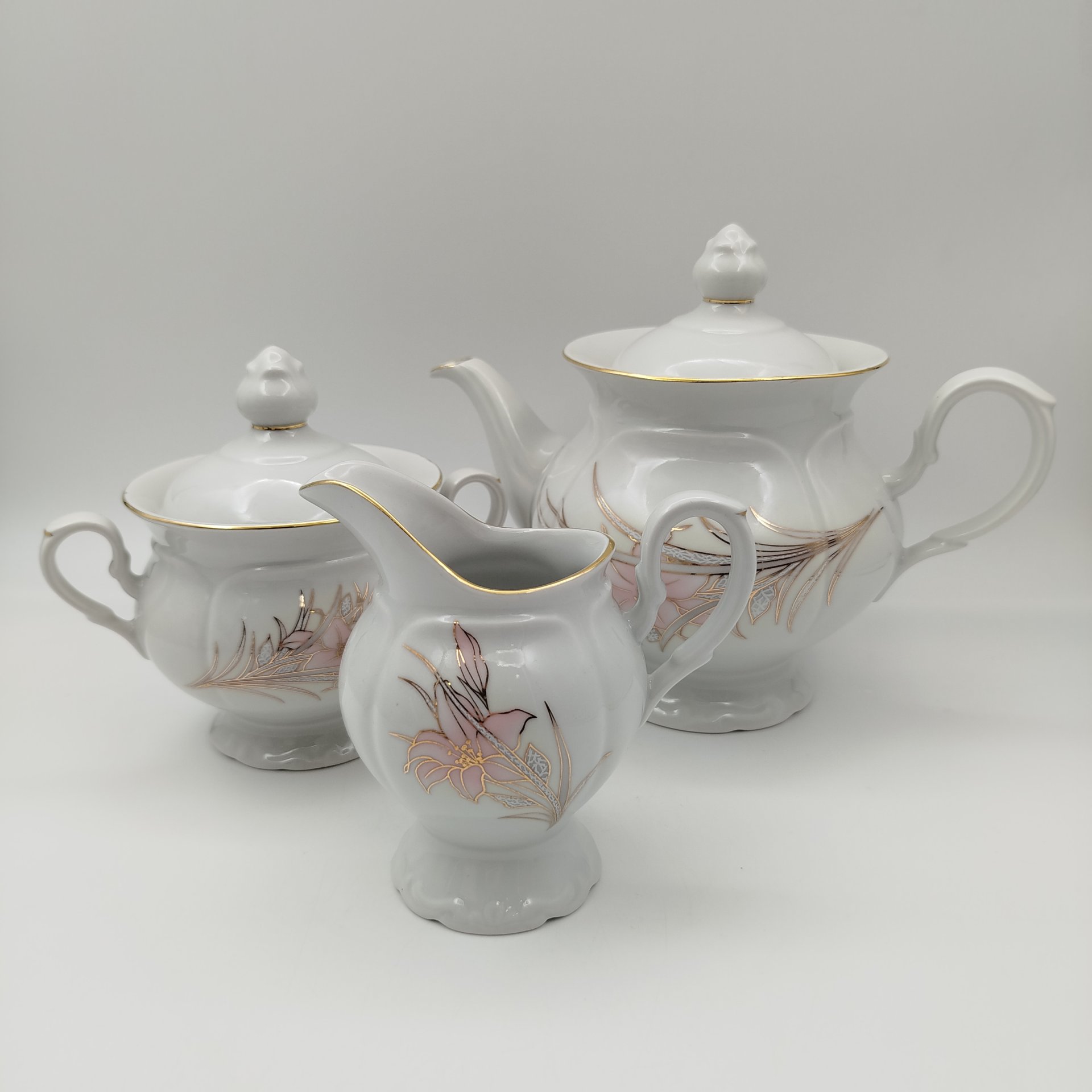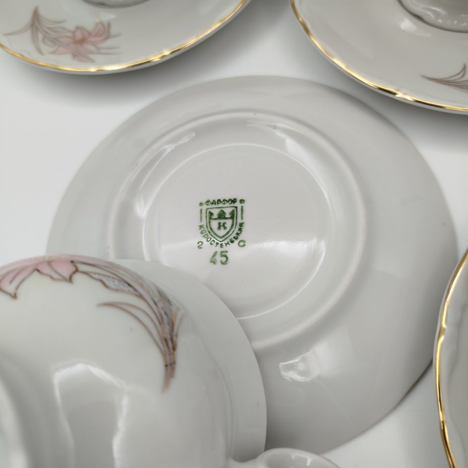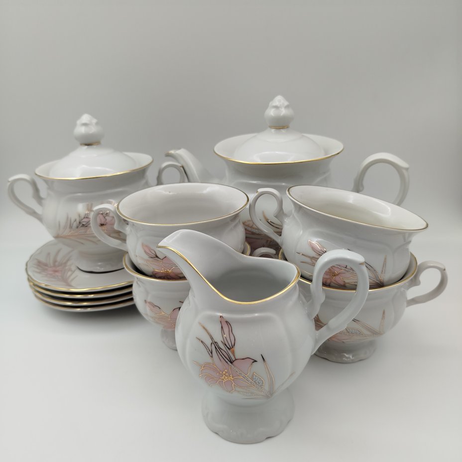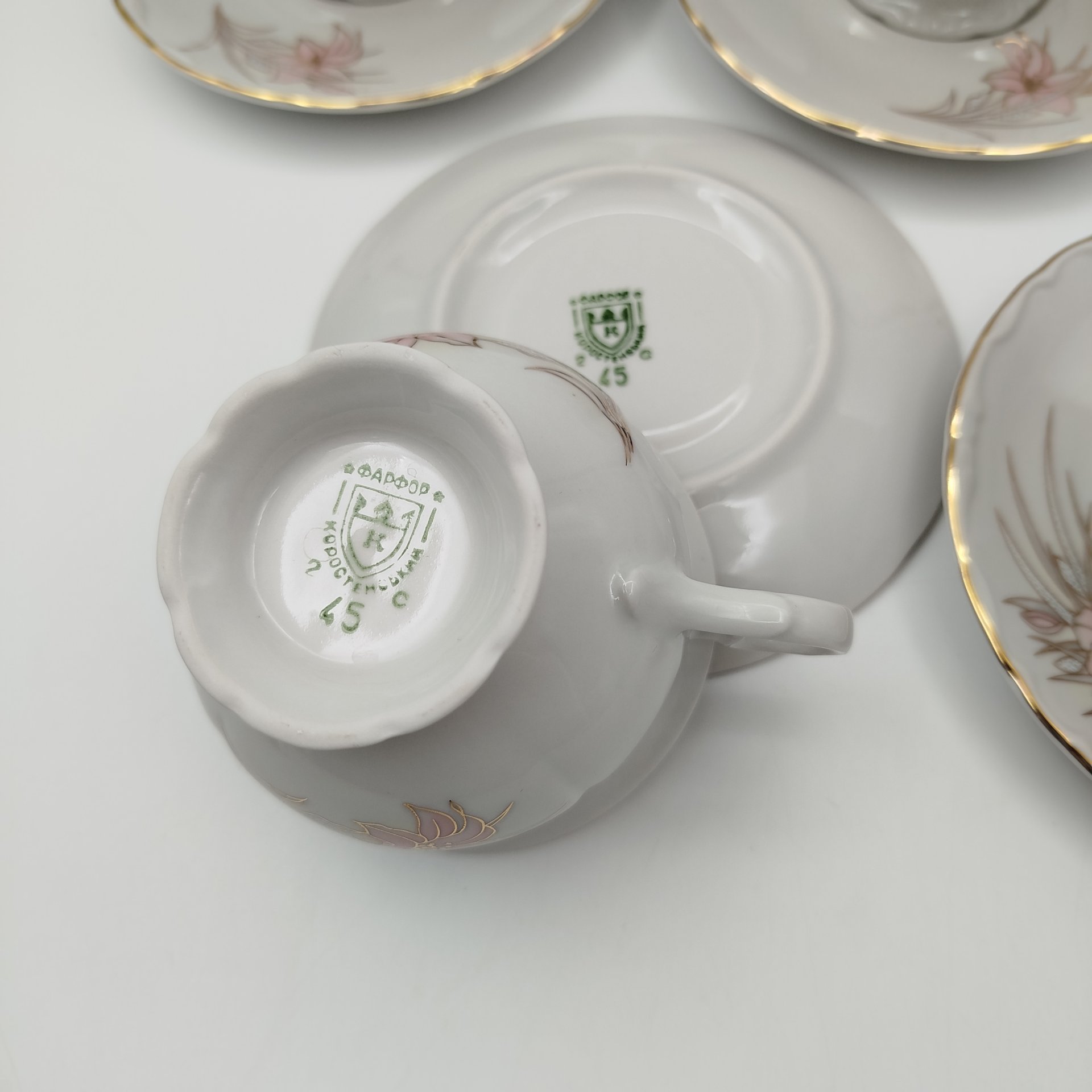 Сервиз чайный "Лилия" на 6 персон (22 предмета), фарфор, деколь, золочение, Ленинградский фарфоровый завод (ЛФЗ), СССР, 1970-1992 гг.