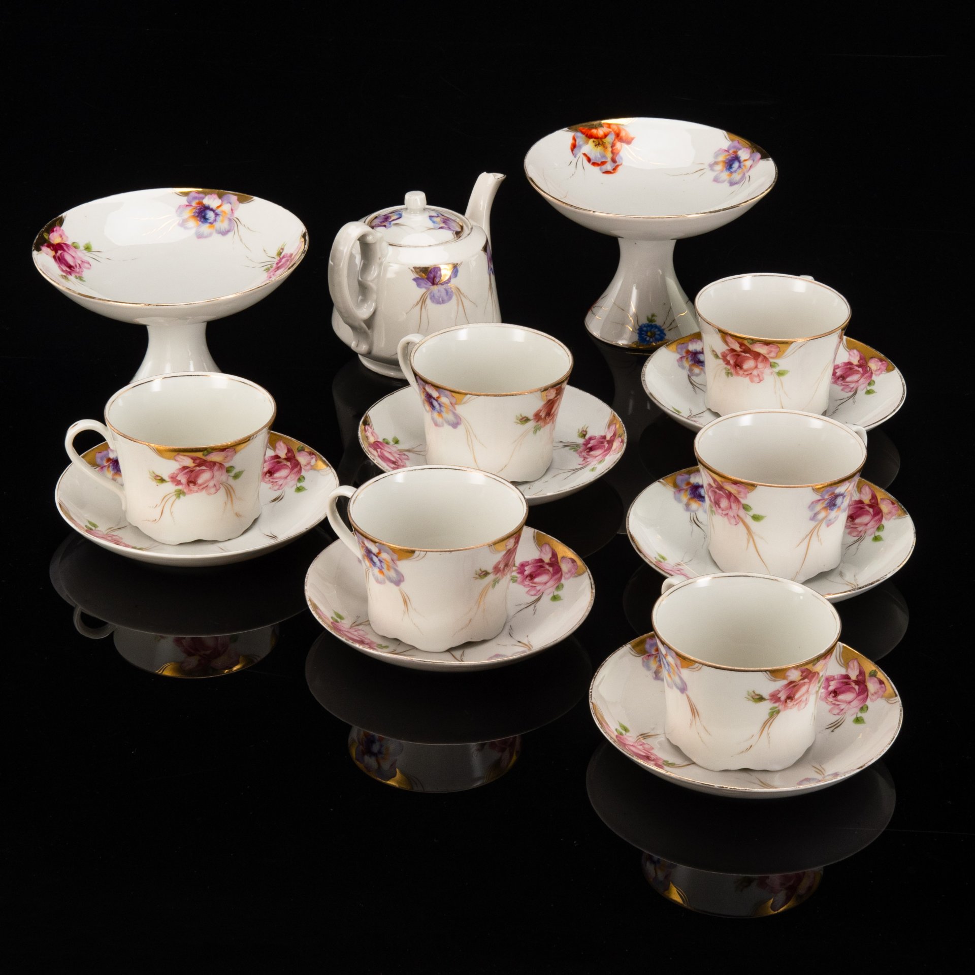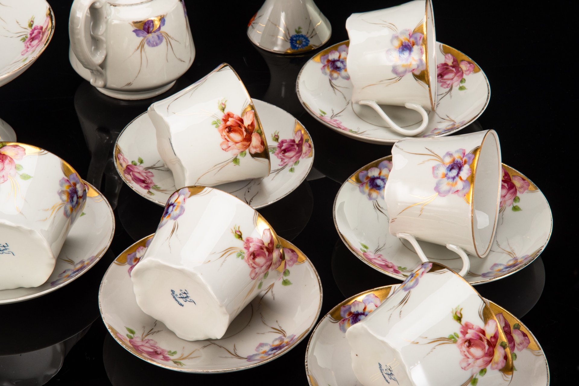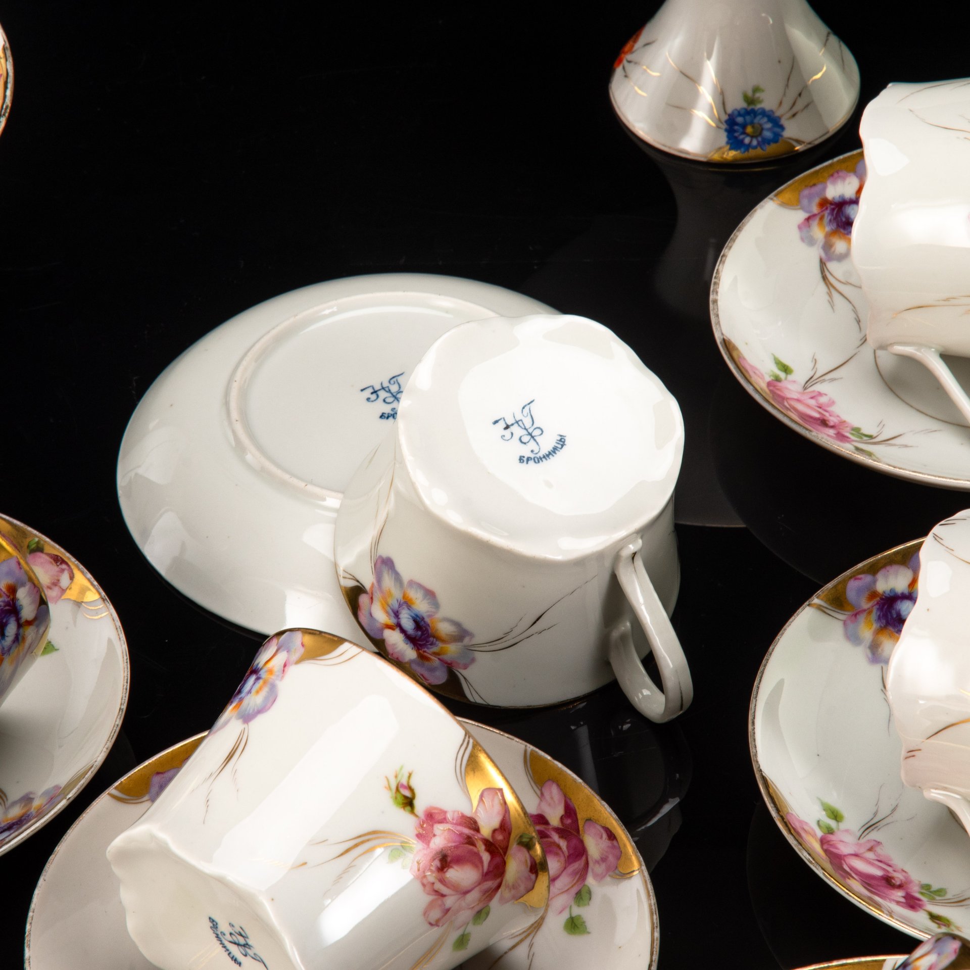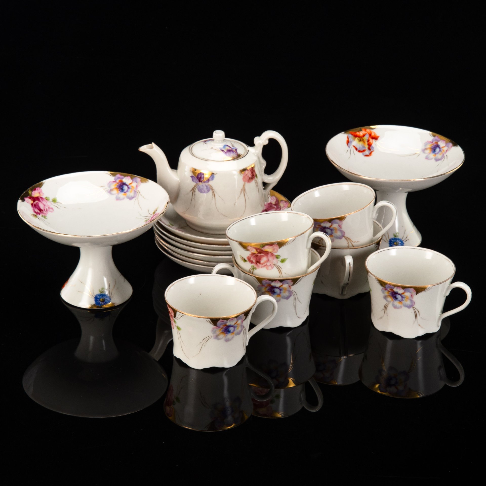 Сервиз чайный с цветочным декором, форма "Рельефная", на 6 персон (13 предметов), фарфор, деколь, золочение, Дмитровский фарфоровый завод (ДФЗ Вербилки), СССР, 1965-1991 гг.