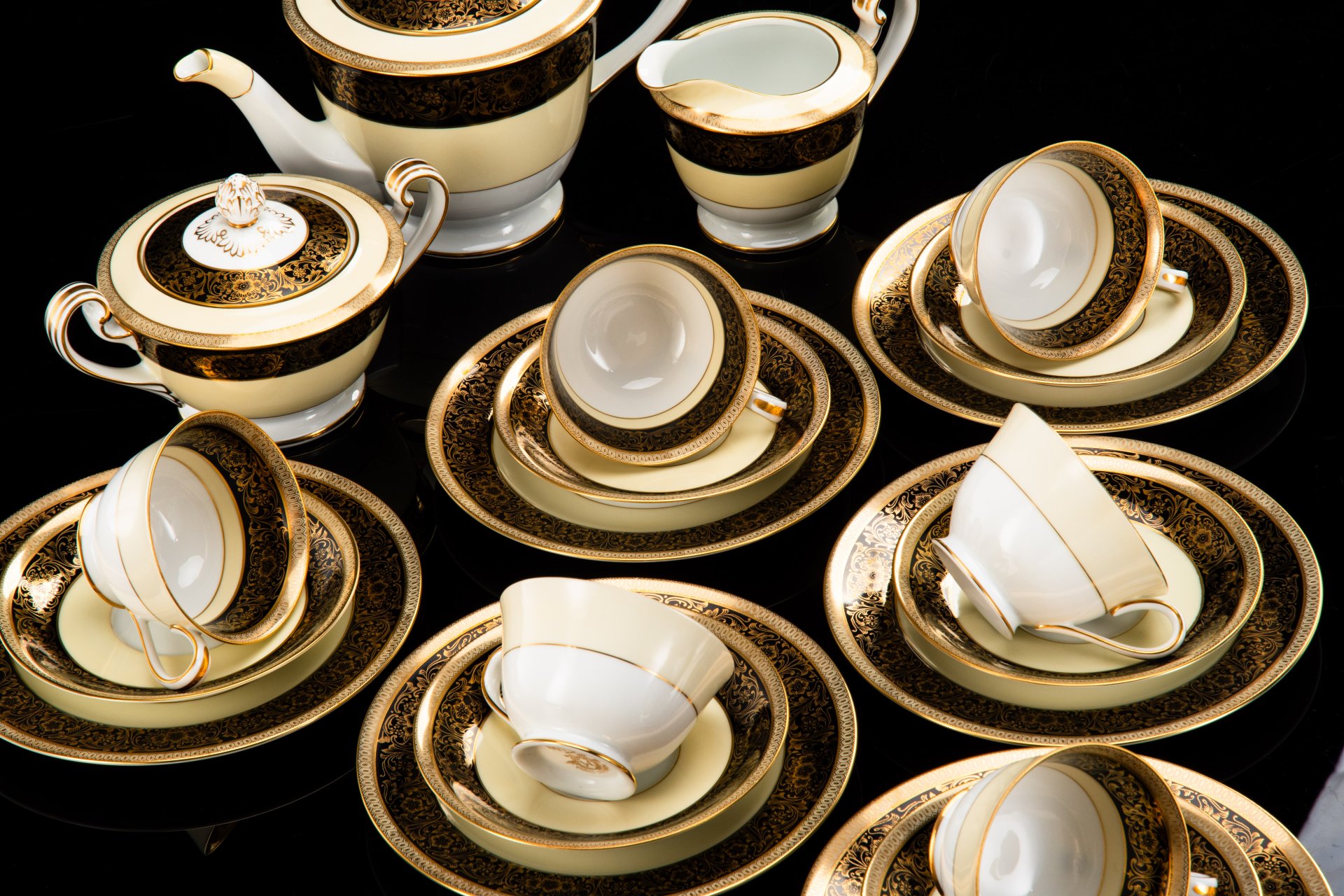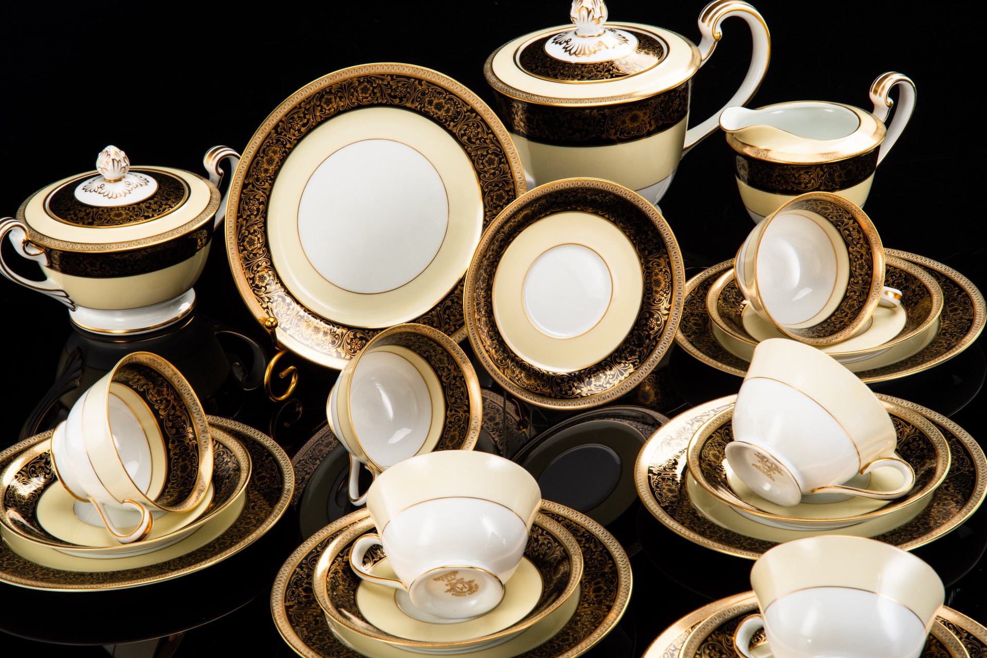 Сервиз чайный "Золотой олень" на 4 персоны (11 предметов), автор росписи П.В. Леонов, фарфор, крытье, роспись, золочение, Дулевский фарфоровый завод (Дулёво), СССР, 1968-1991 гг.