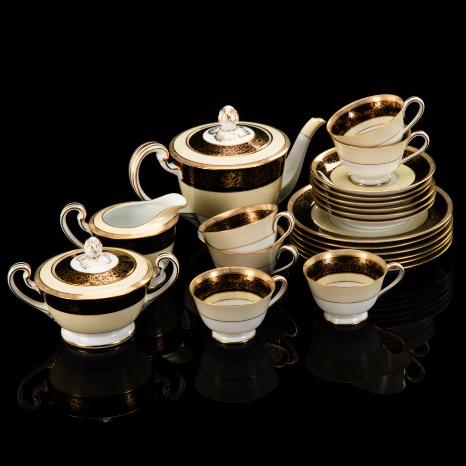 Сервиз чайный "Лилия" на 6 персон (22 предмета), фарфор, деколь, золочение, Ленинградский фарфоровый завод (ЛФЗ), СССР, 1970-1992 гг.