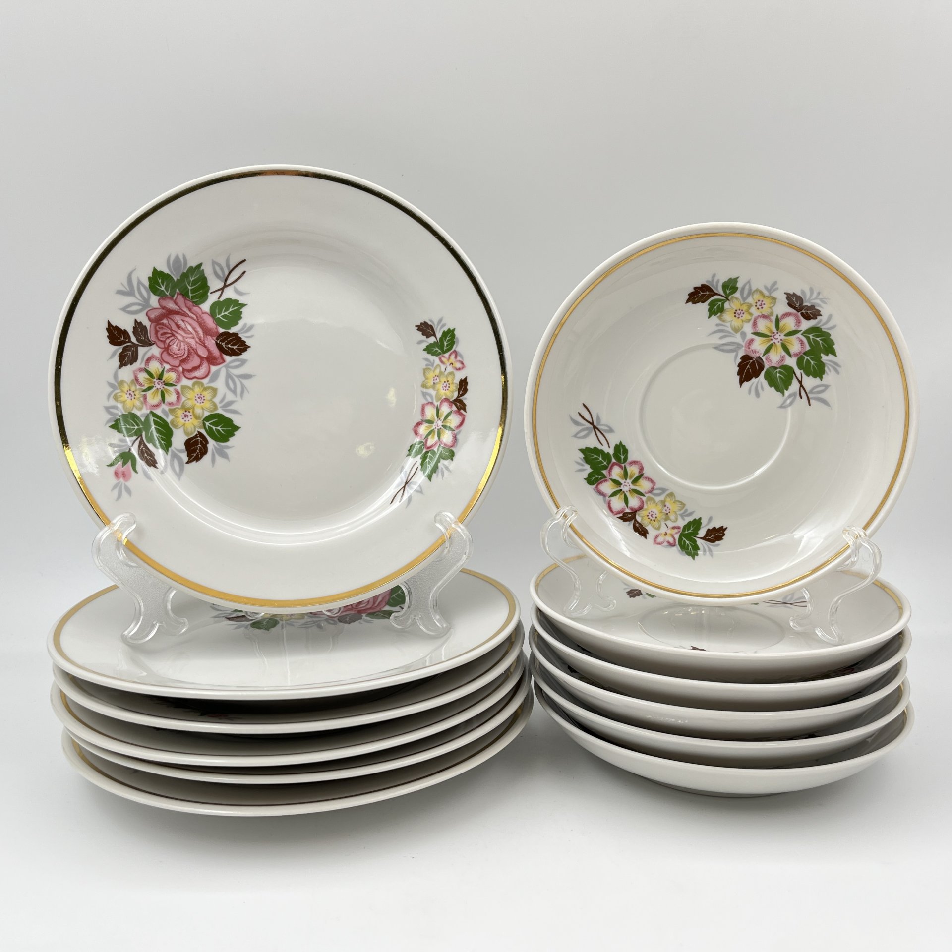 Сервиз чайный на 5 персон, украшенный цветочным декором, фарфор, деколь, золочение, Дулевский фарфоровый завод (Дулёво), СССР, 1958 г.