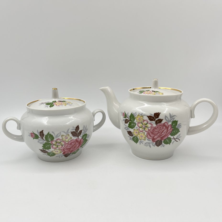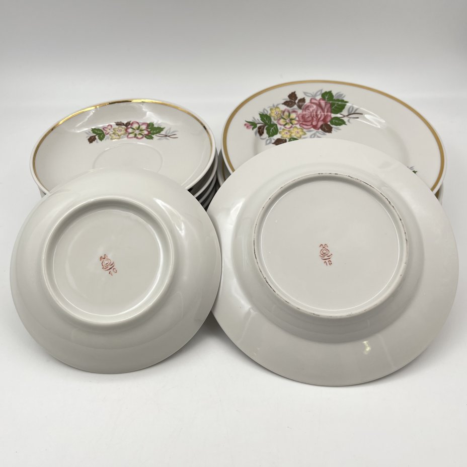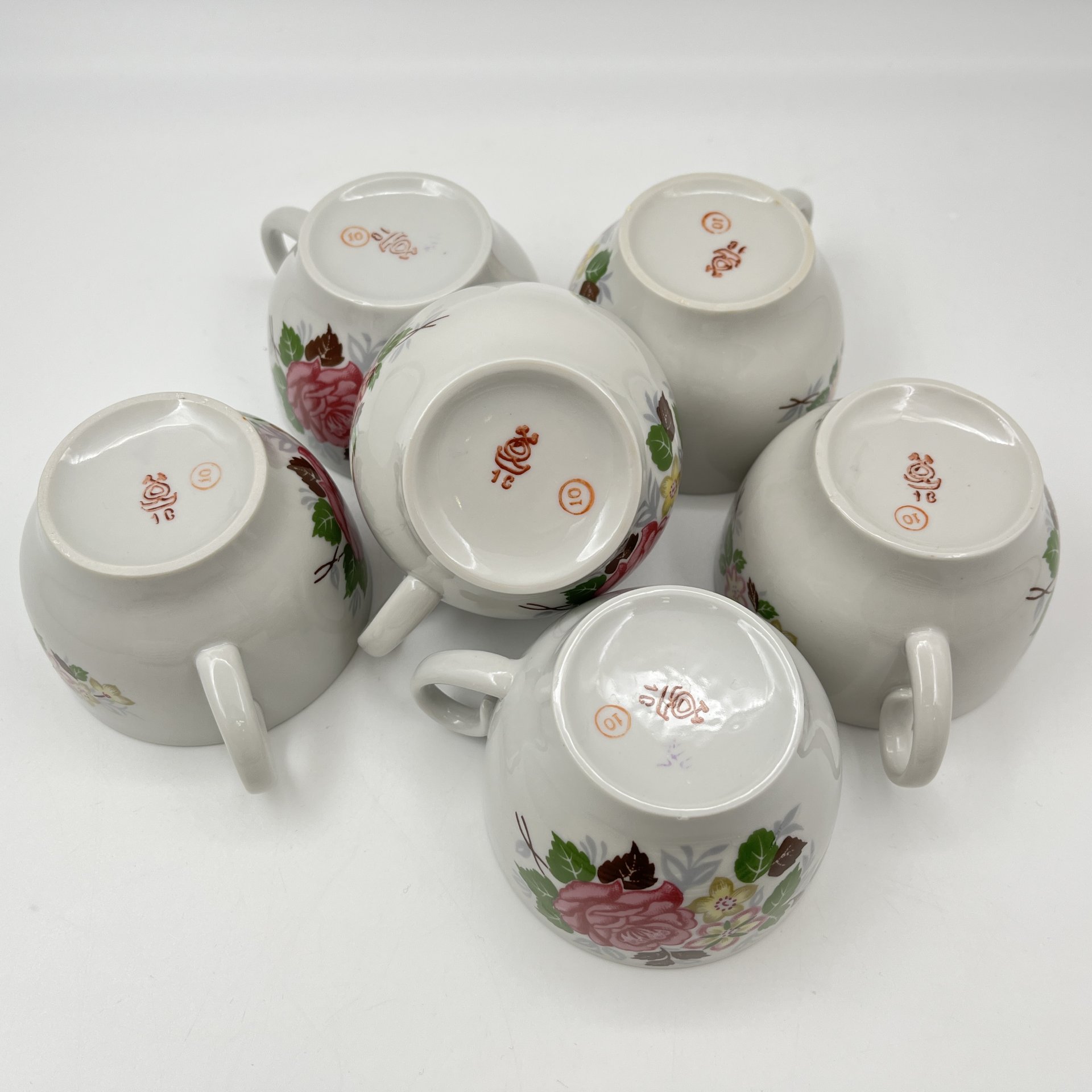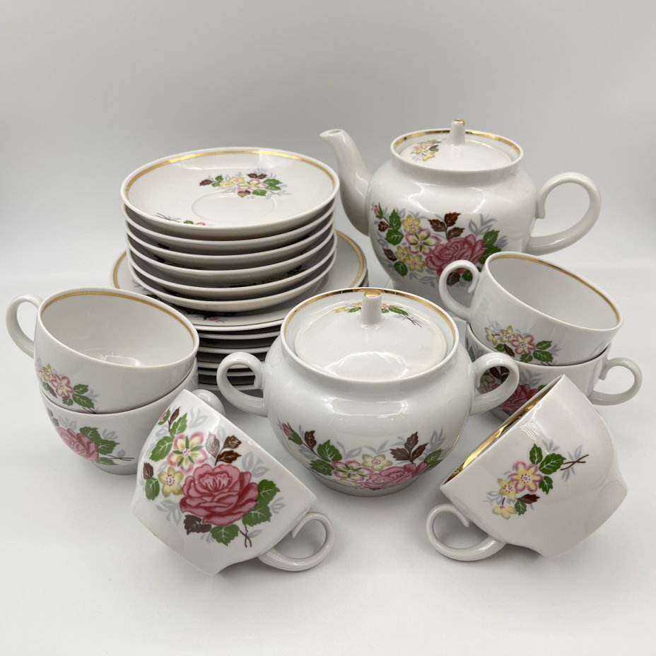 Сервиз чайный на 6 персон, украшенный декором в виде роз (21 предмет), фарфор, деколь, люстр, Дмитровский фарфоровый завод (ДФЗ Вербилки), СССР, 1980-1991 гг.