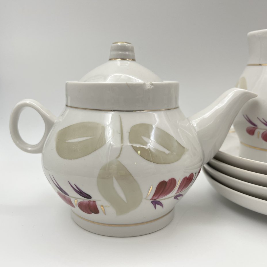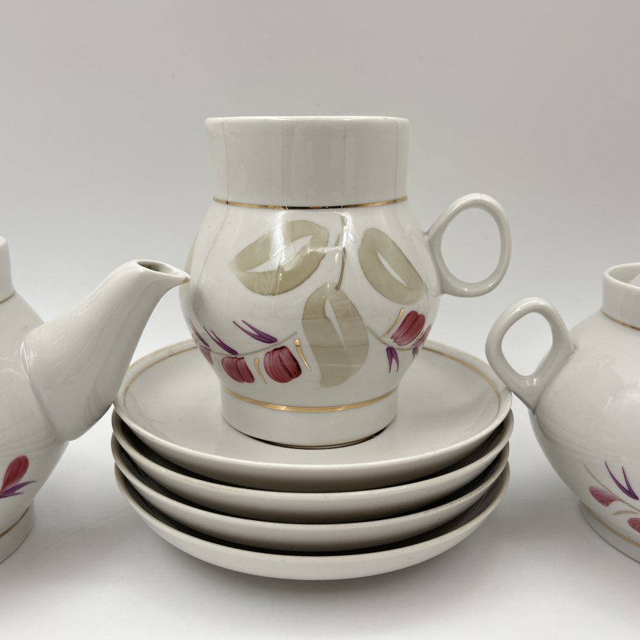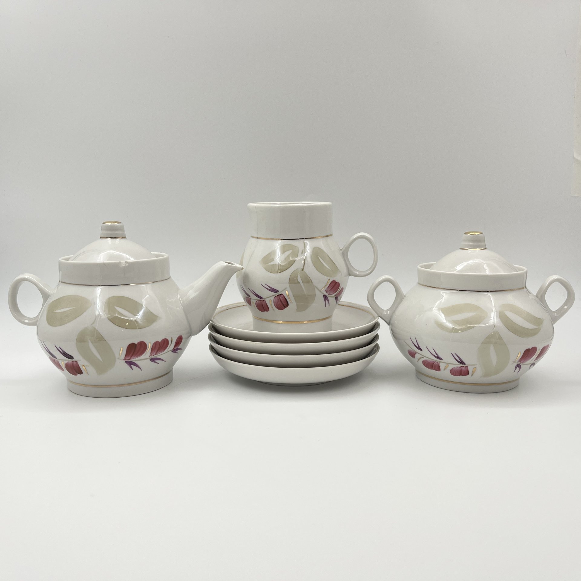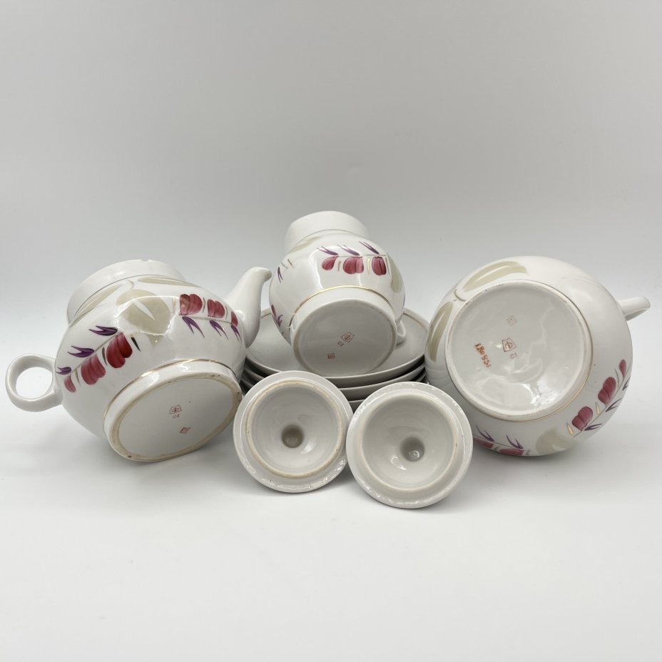 Сервиз чайный "Пурпурный лист" на 5 персон (17 предметов), автор Смирнов Е.П., фарфор, роспись, золочение, Дмитровский фарфоровый завод (ДФЗ Вербилки), СССР, 1965-1991 гг.