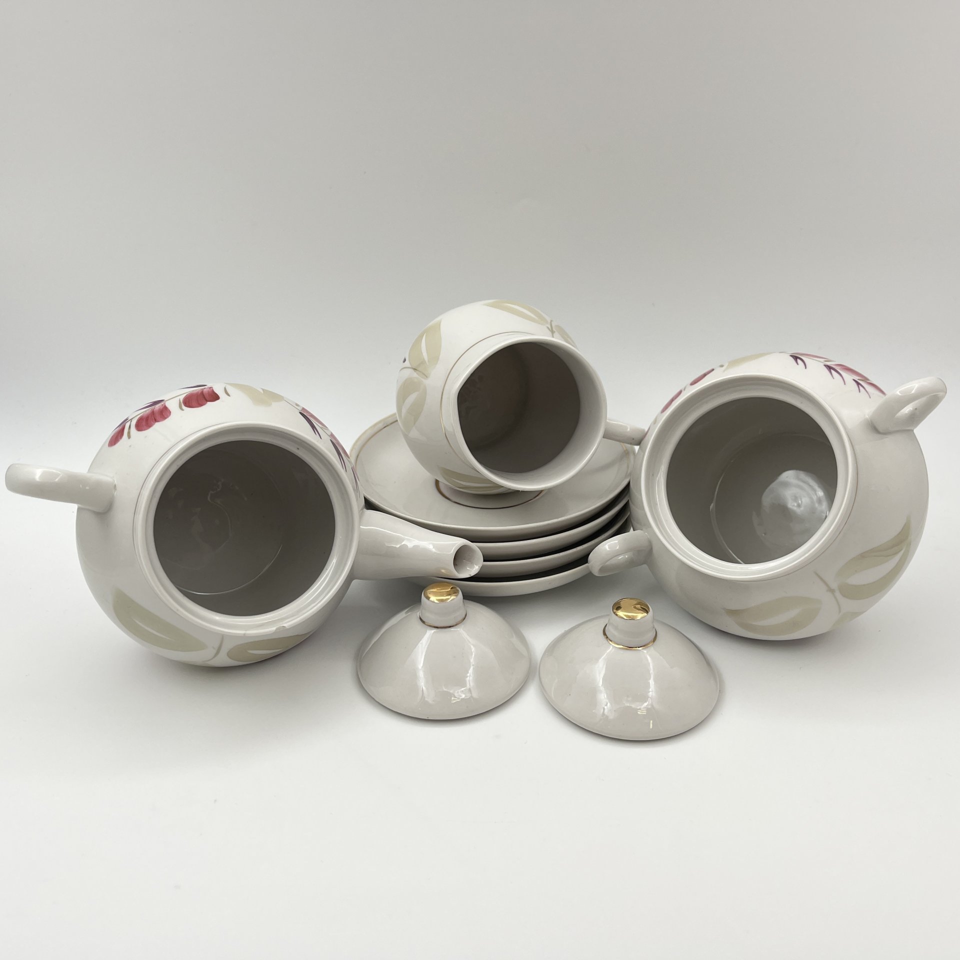 Сервиз чайный с растительным декором на 4 персоны (чайник, сахарница, 4 чайные пары), фарфор, роспись, золочение, Volkstedt Beyer & Bock, ГДР, 1960-1980 гг.