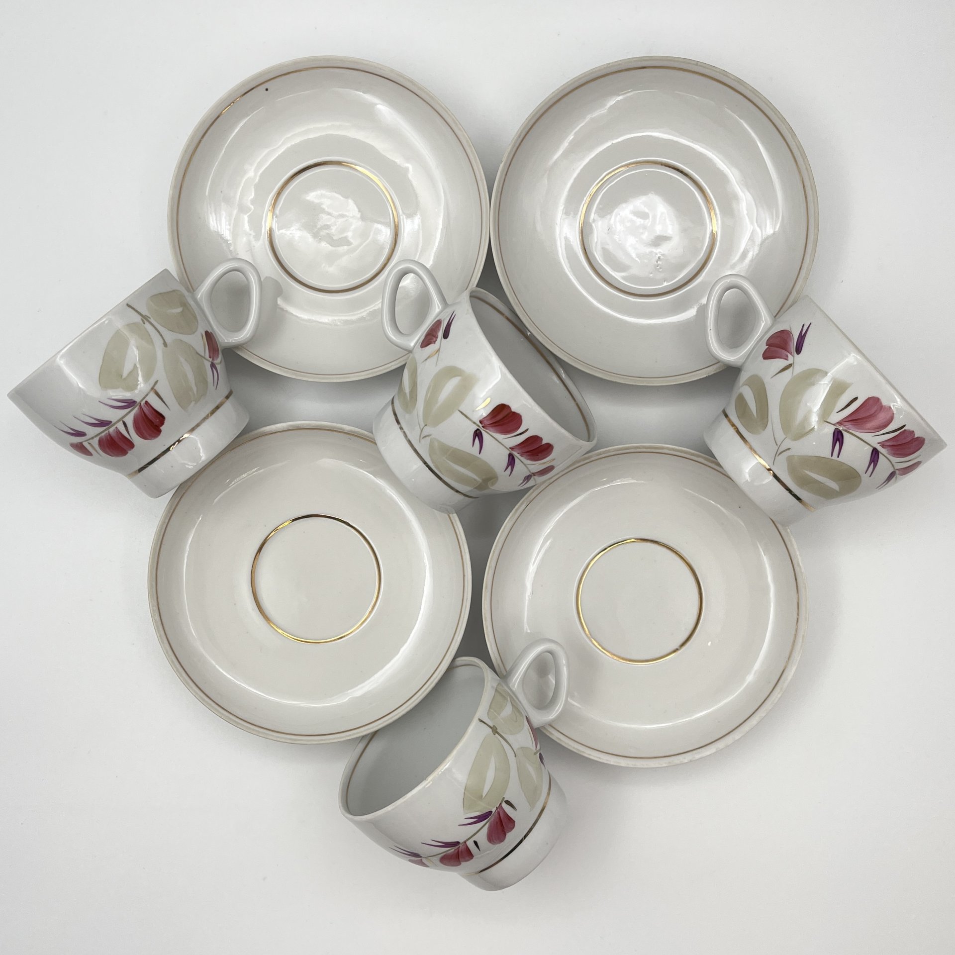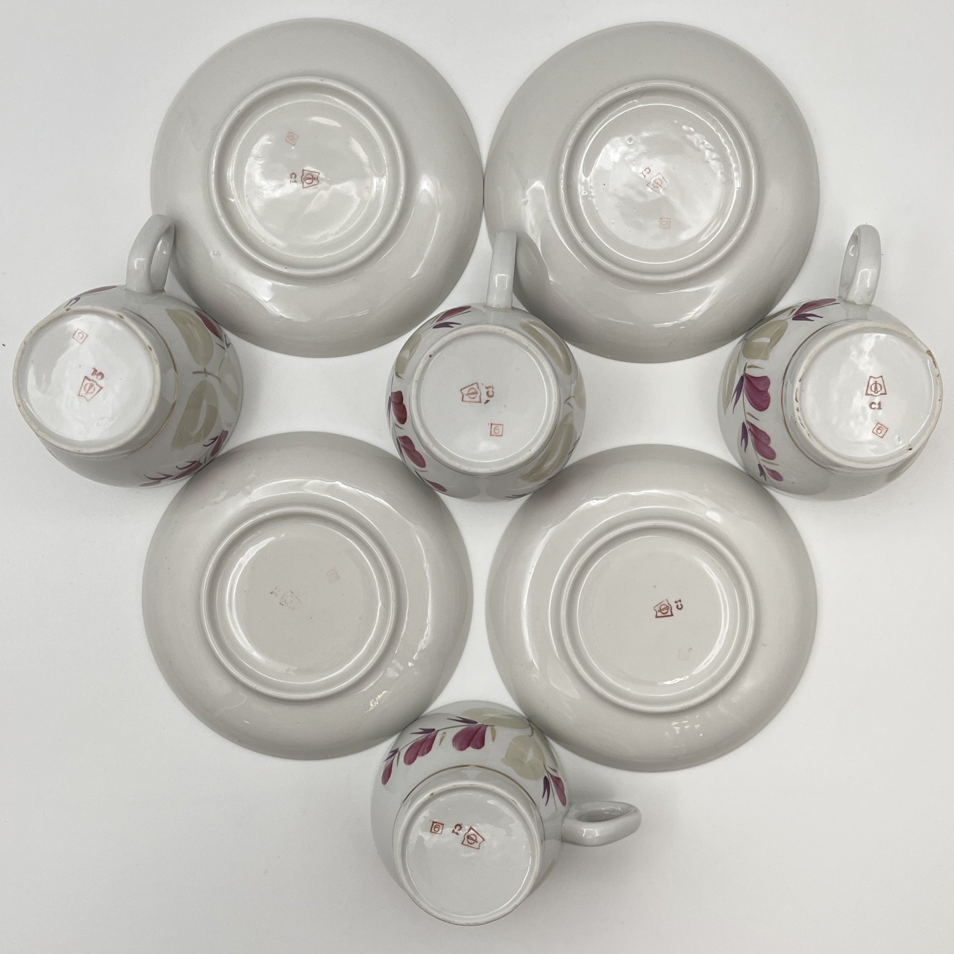 Сервиз чайный "Барбарис" в пурпурном оттенке на 7 персон, автор Е.П. Смирнов (17 предметов), фарфор, роспись, золочение, Дмитровский фарфоровый завод (ДФЗ Вербилки), СССР, 1954-1965 гг.