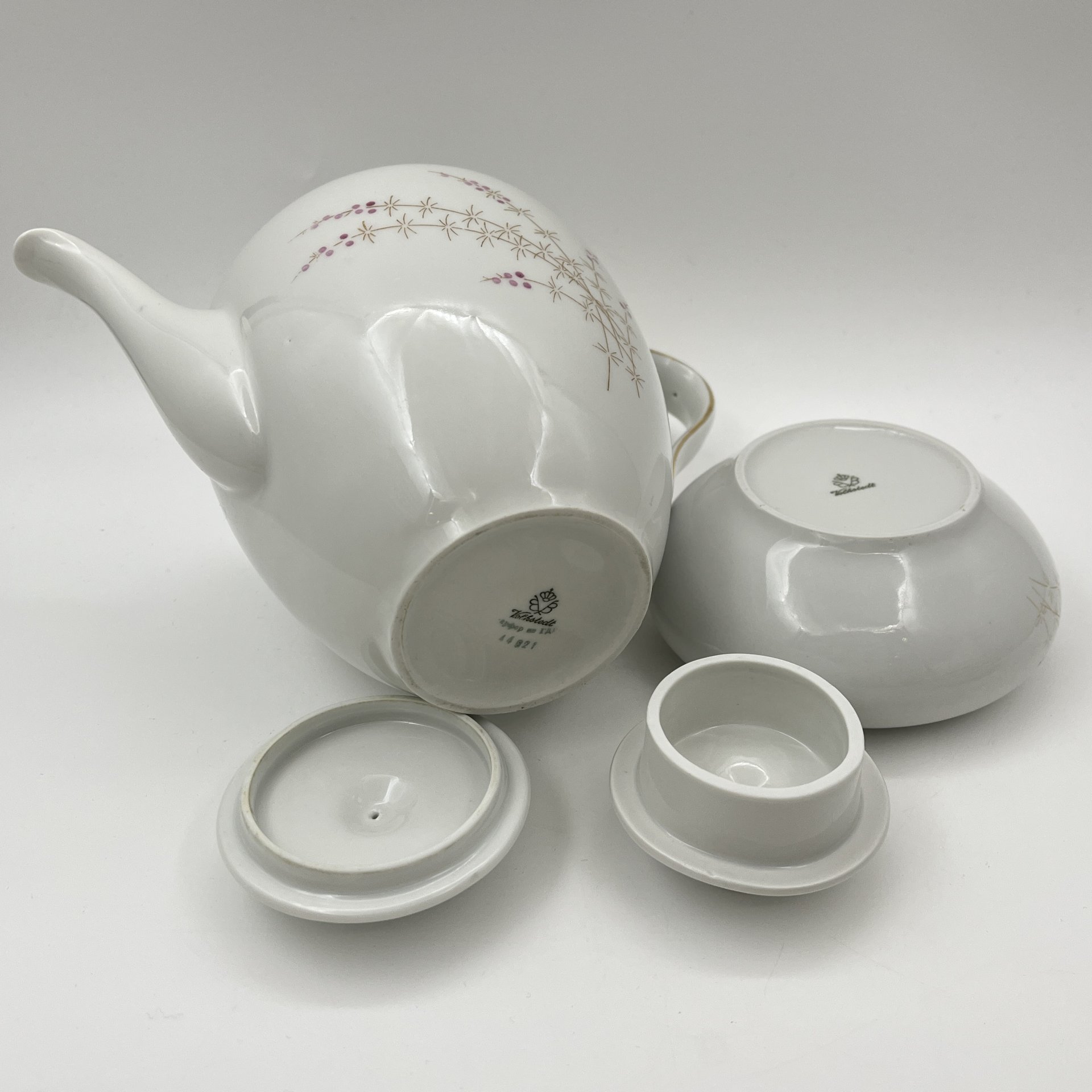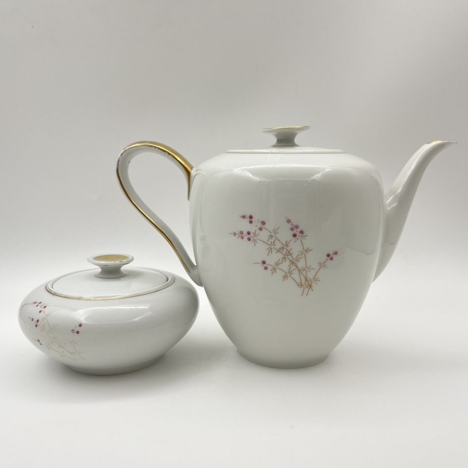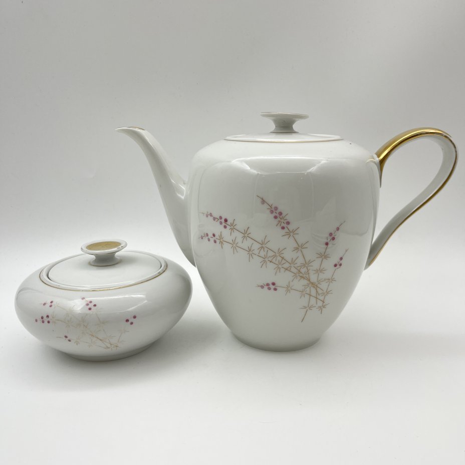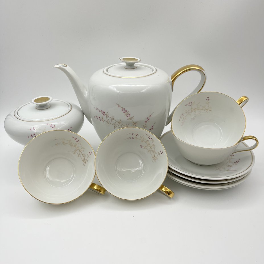 Сервиз чайный "Жемчужный" на 6 персон (15 предметов), автор формы "Весенняя" Яковлева С.Е., автор рисунка Семенова А.Н., фарфор, люстр, деколь, золочение, Ленинградский фарфоровый завод (ЛФЗ), СССР, 1970-1986 гг.