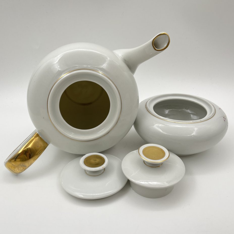Заварочный чайник с расписным цветочным декором (крышка в подборе), автор формы "Тюльпан" С.Е. Яковлева, автор рисунка Л.И. Григорьева, фарфор, роспись, золочение, Ленинградский фарфоровый завод (ЛФЗ), СССР, 1970-1990 гг.