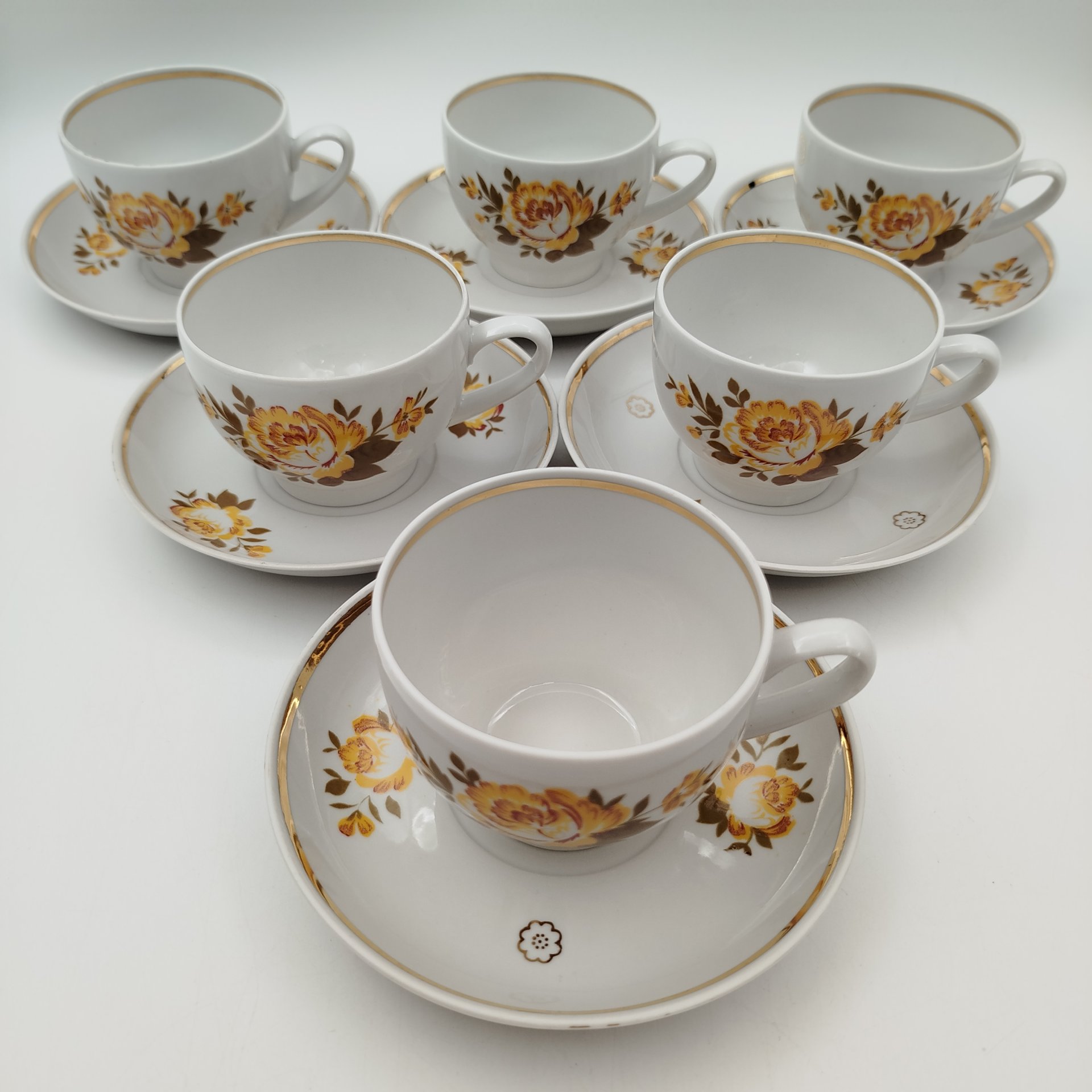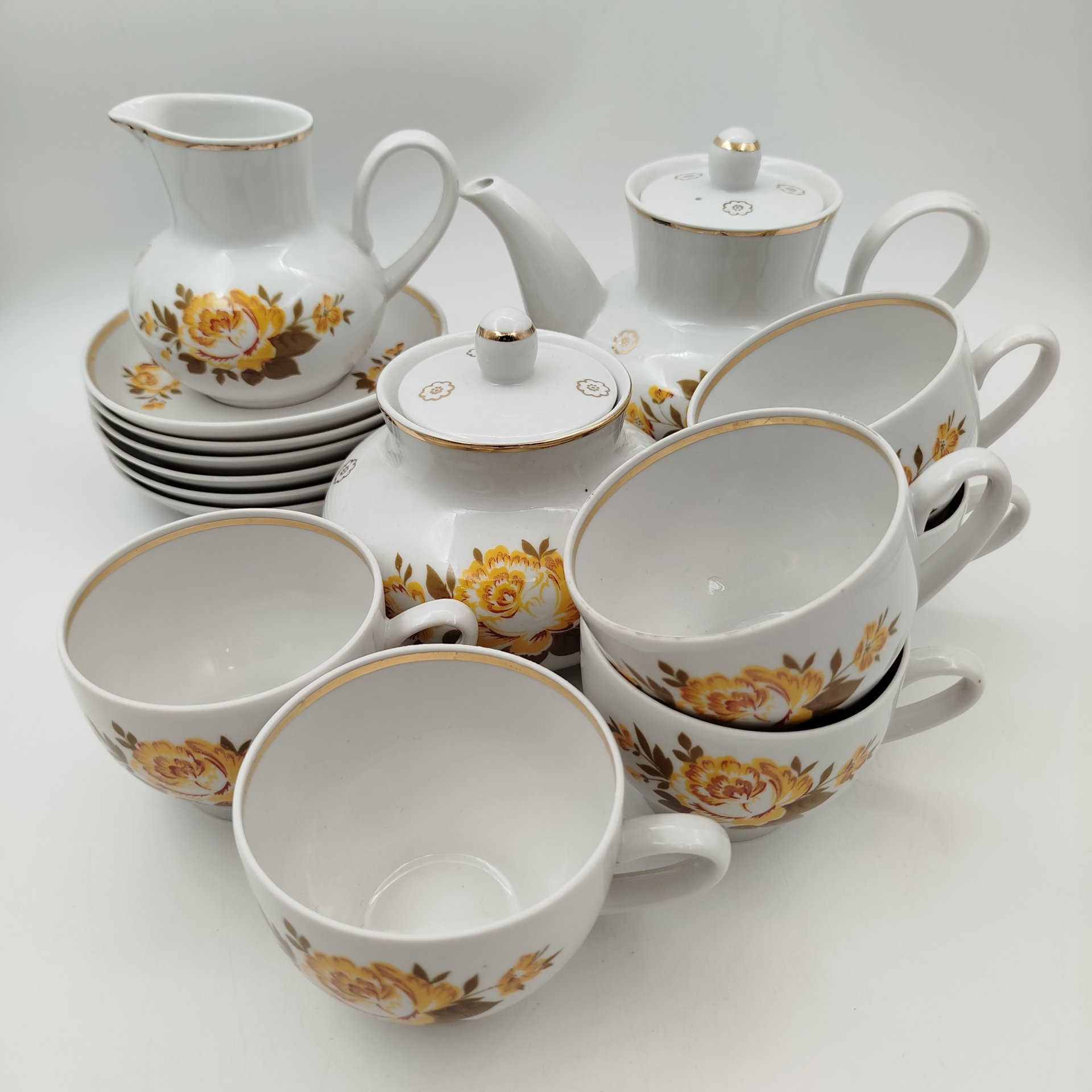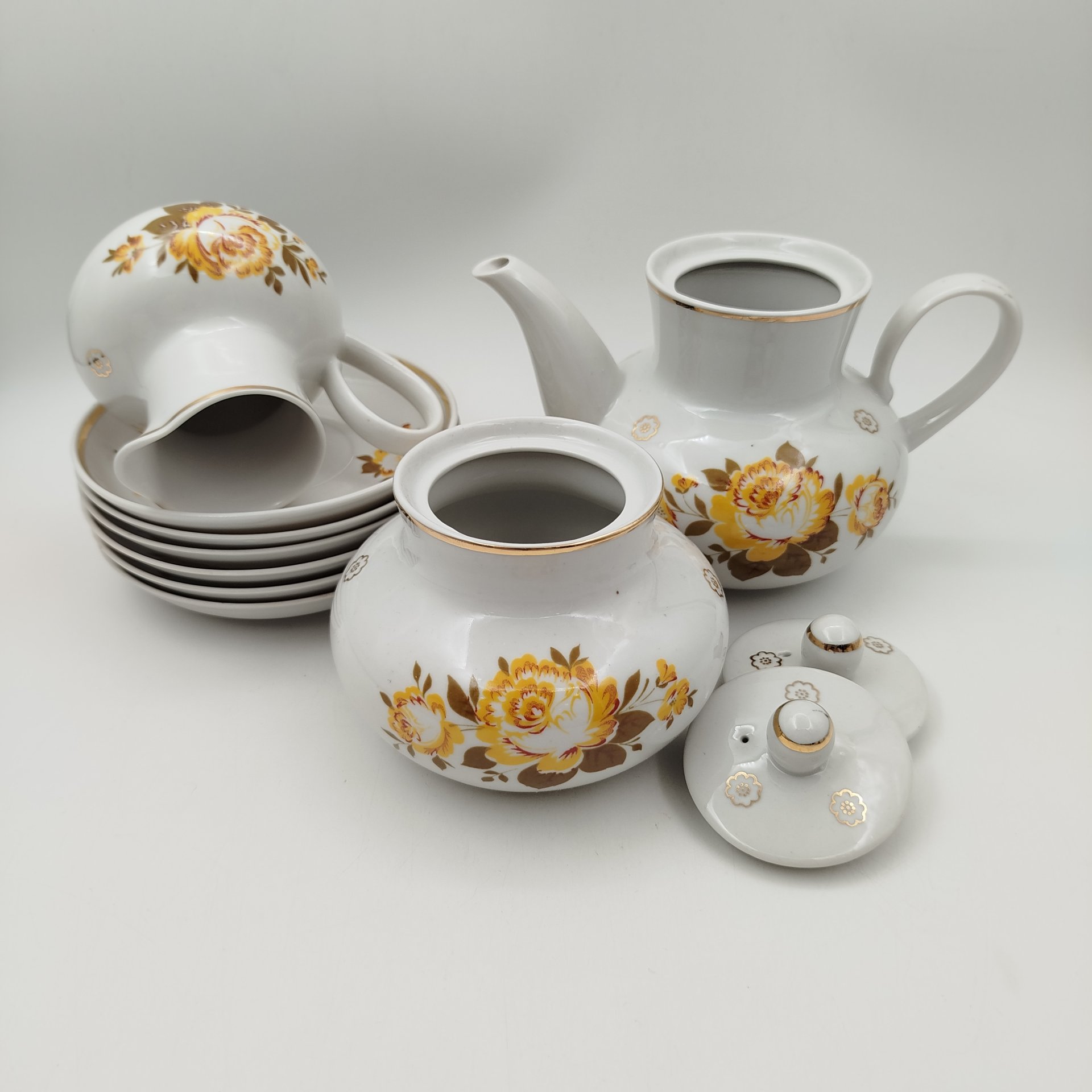 Сервиз чайный с декором в виде жёлтых цветов на 6 персон (15 предметов), фарфор, деколь, золочение, Дмитровский фарфоровый завод (ДФЗ Вербилки), СССР, 1965-1991 гг.
