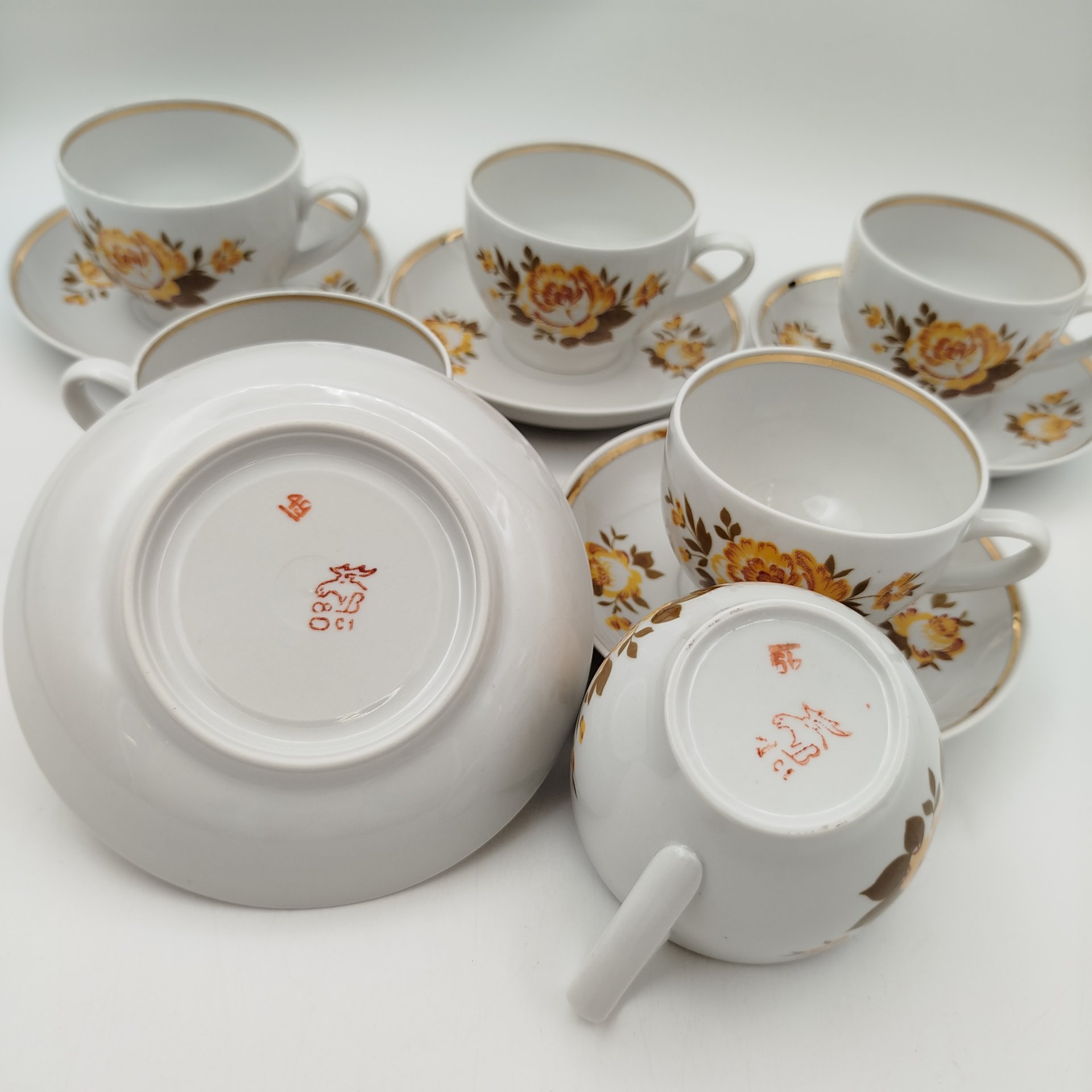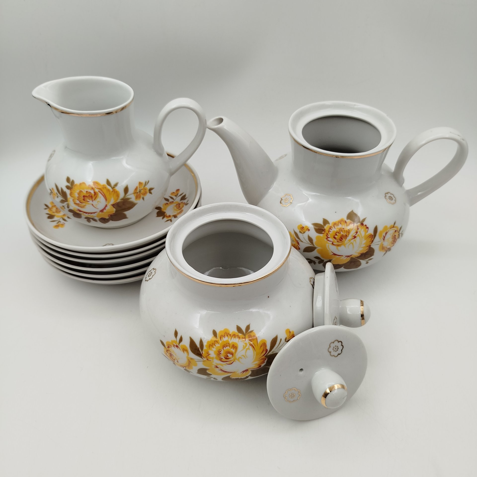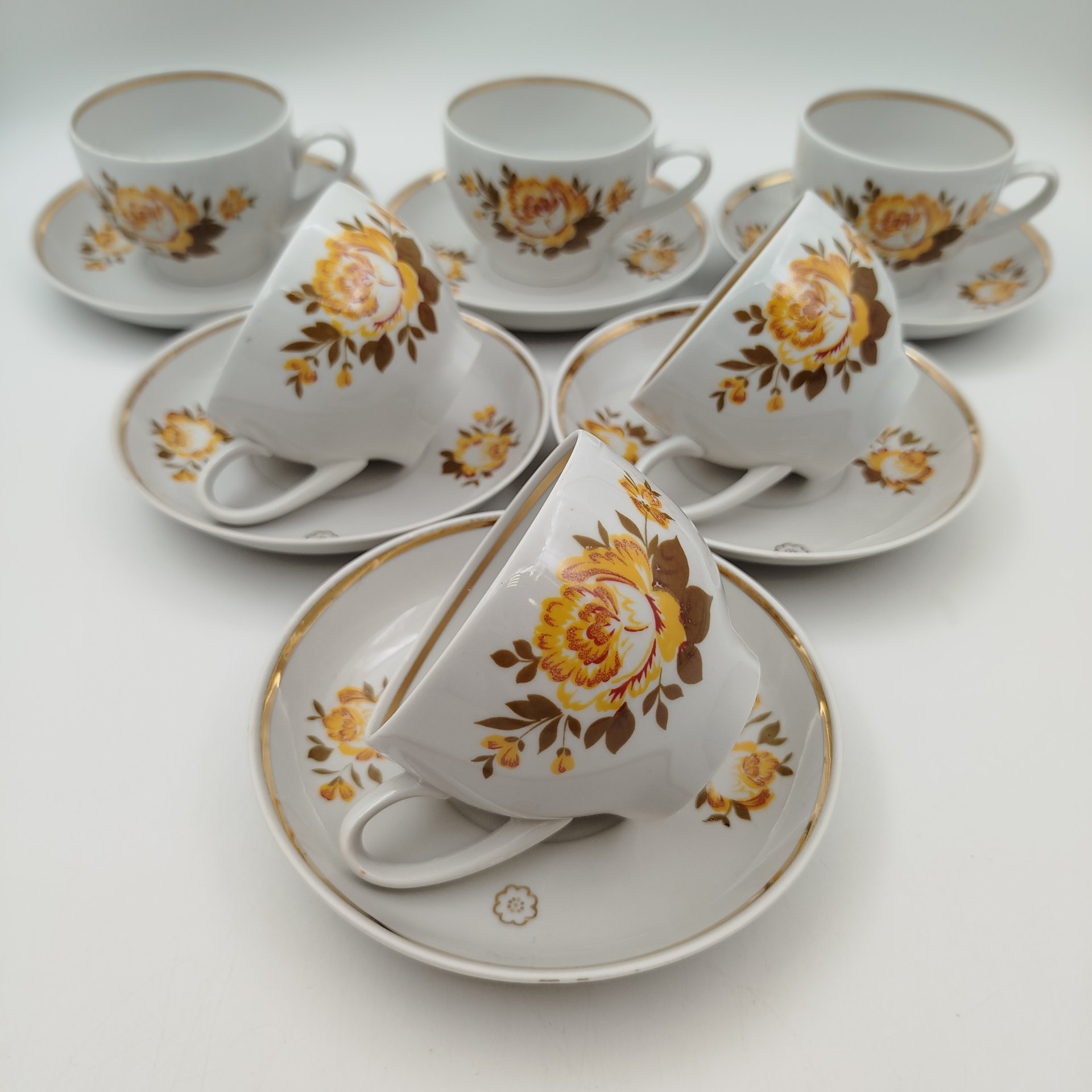Сервиз чайный с декором в виде жёлтых цветов на 6 персон (15 предметов), фарфор, деколь, золочение, Дмитровский фарфоровый завод (ДФЗ Вербилки), СССР, 1965-1991 гг.