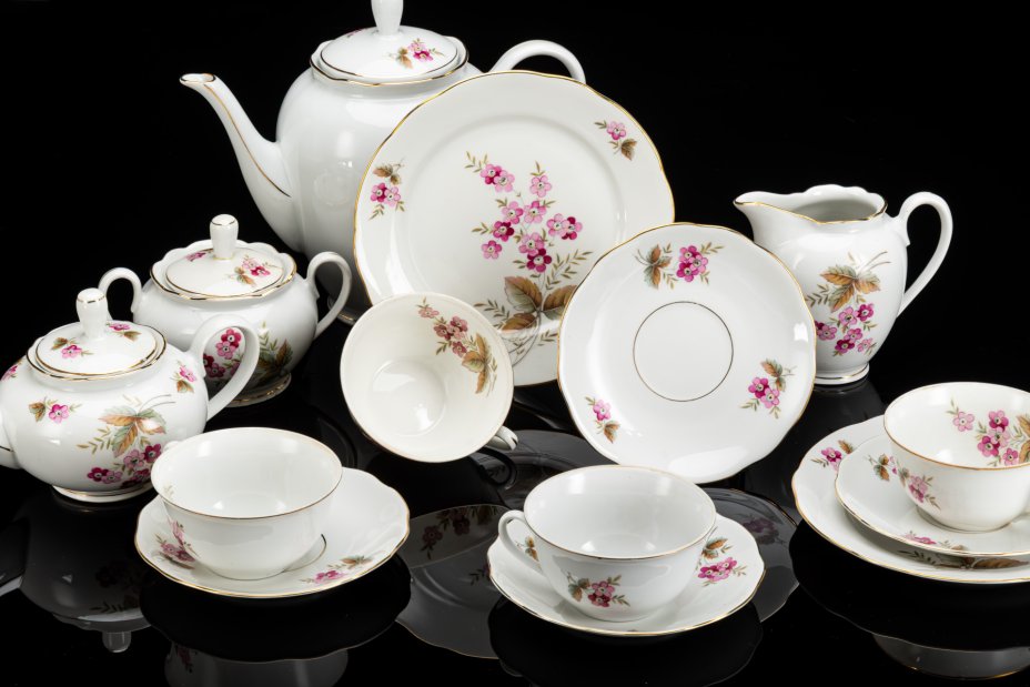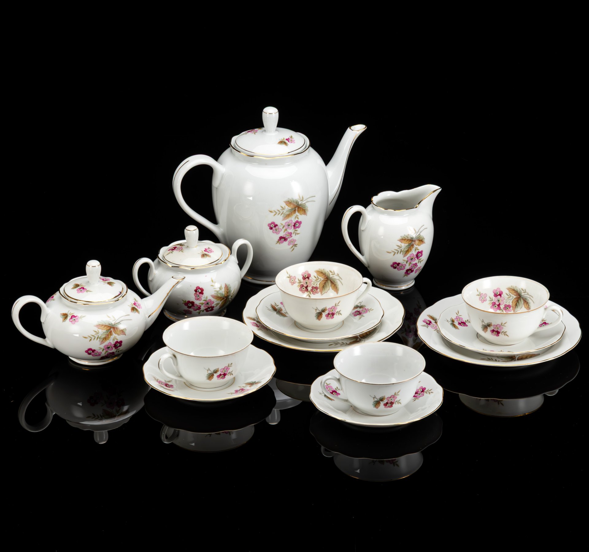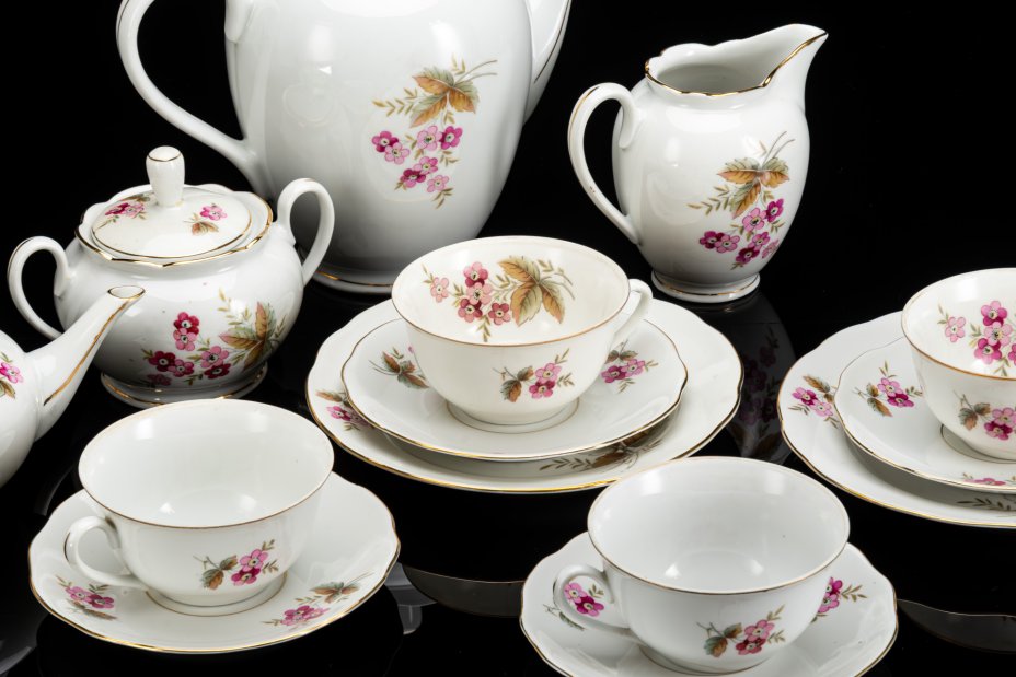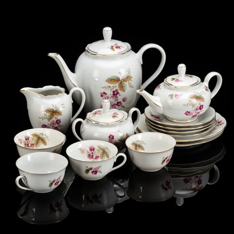 Сервиз "Букет чайных роз" на 5 персон (14 предметов), фарфор, роспись, золочение, Ленинградский фарфоровый завод (ЛФЗ), СССР, 1970-1991 гг.