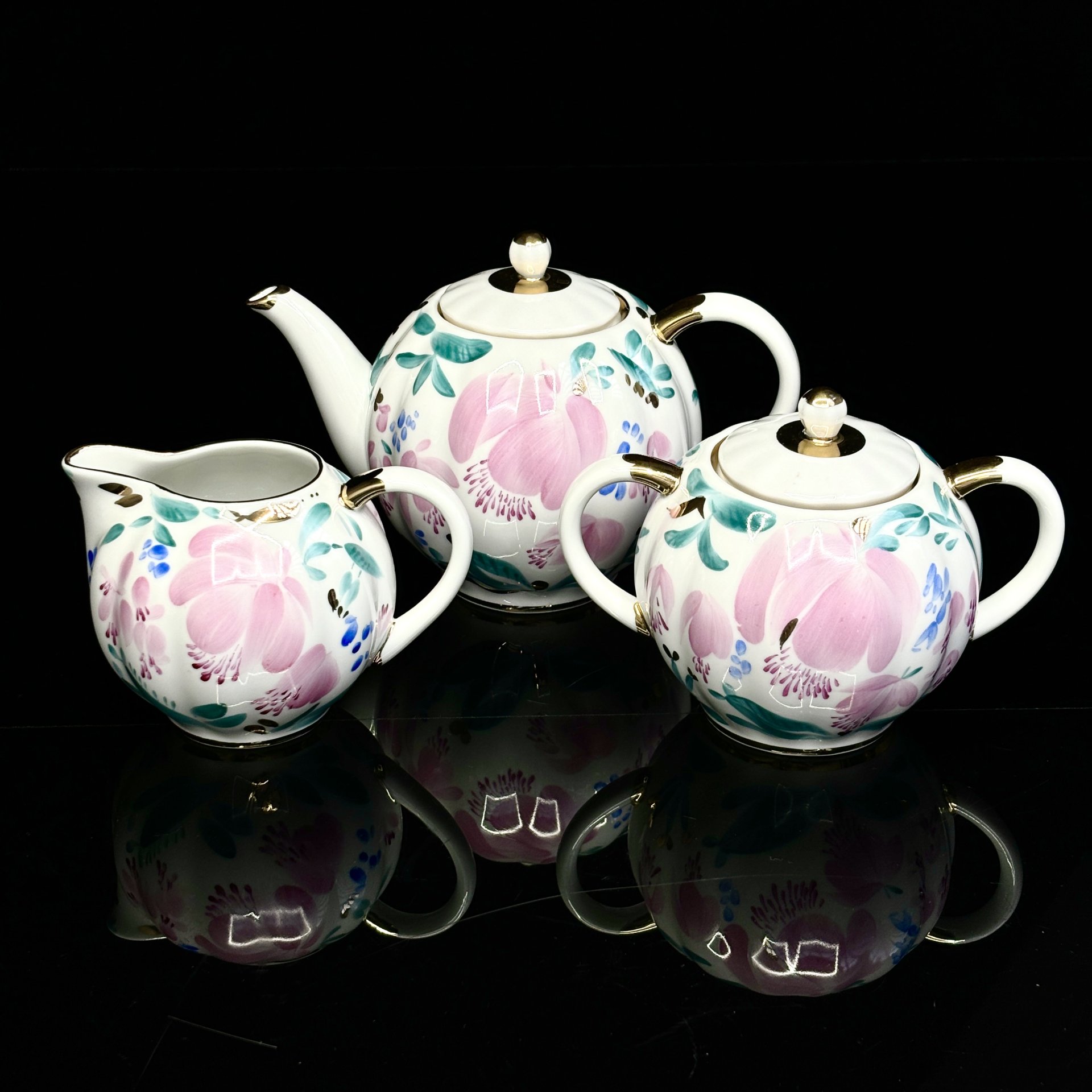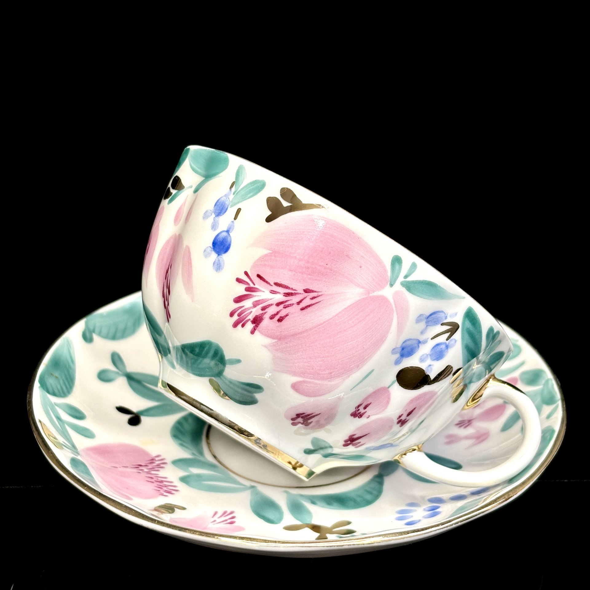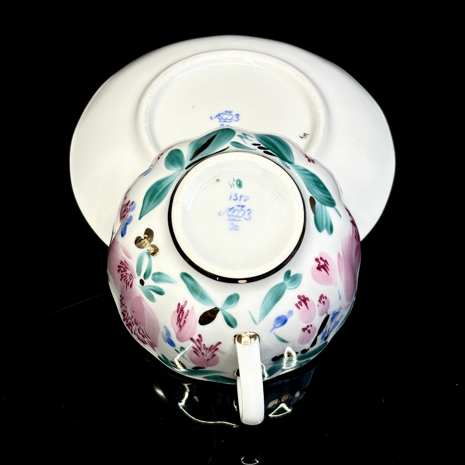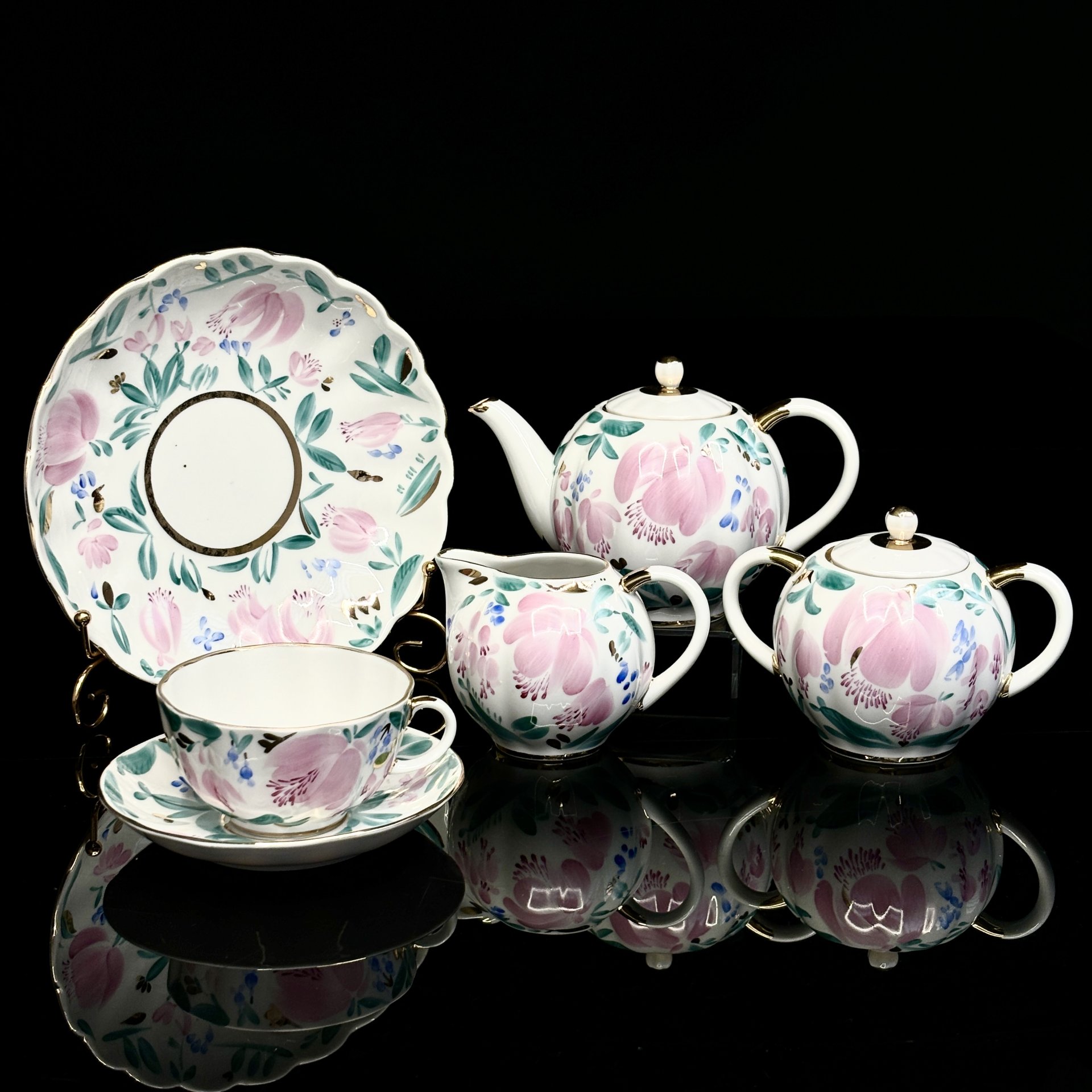 Сервиз чайный "Тюльпаны" ("Розовые цветы") на 1 персону, 6 предметов, автор формы "Тюльпан" С.Е. Яковлева, автор рисунка Л.И. Григорьева, фарфор, роспись, золочение, Ленинградский фарфоровый завод (ЛФЗ), СССР, 1970-1990 гг.