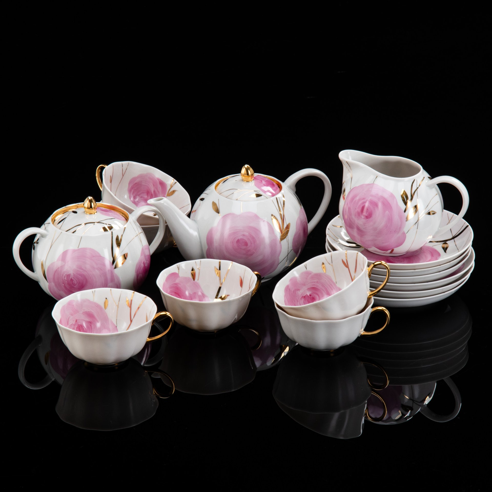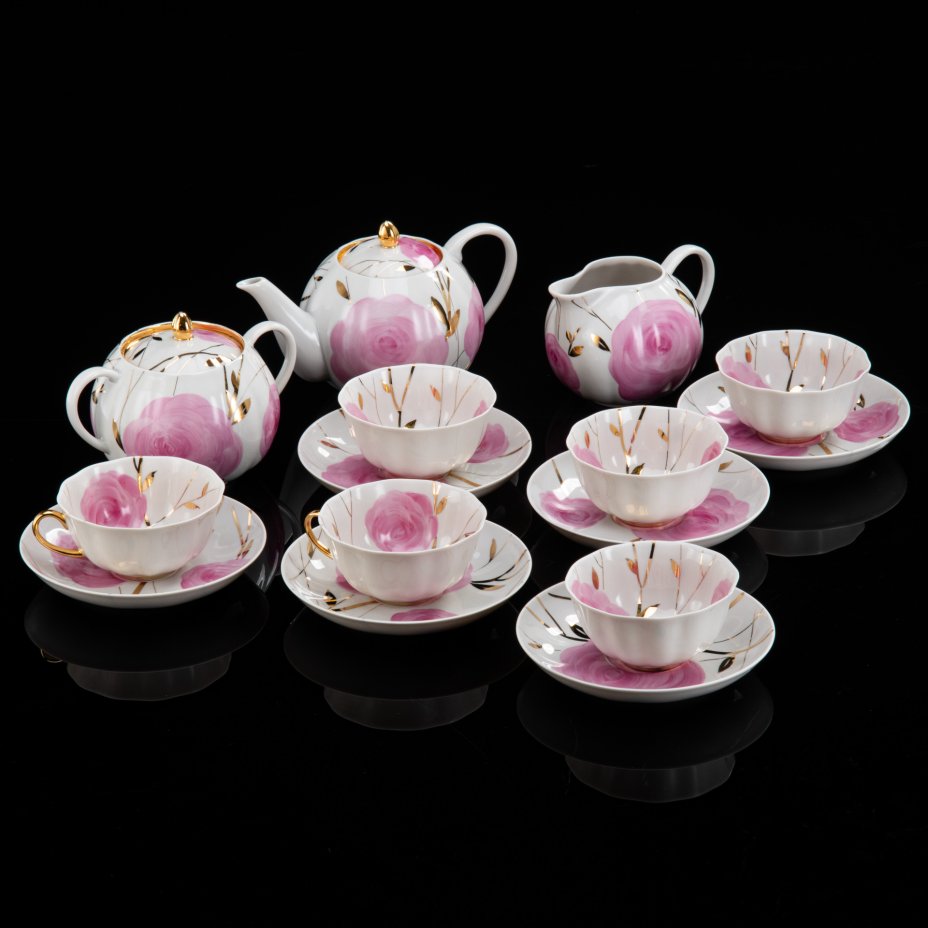 Сервиз чайный с цветочным декором, форма "Рельефная", на 6 персон (13 предметов), фарфор, деколь, золочение, Дмитровский фарфоровый завод (ДФЗ Вербилки), СССР, 1965-1991 гг.