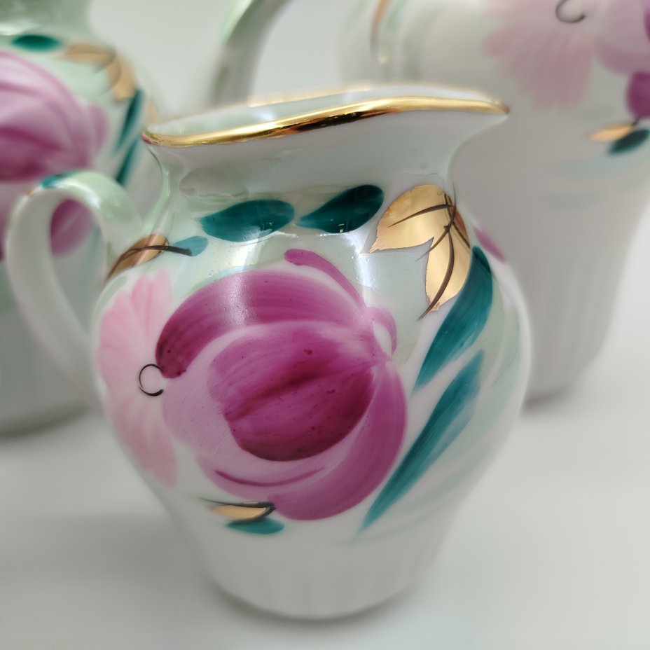 Сервиз чайный на 5 персон с цветочным декором (19 предметов), фарфор, роспись, люстр, золочение, Дулевский фарфоровый завод (Дулёво), СССР, 1987 г.