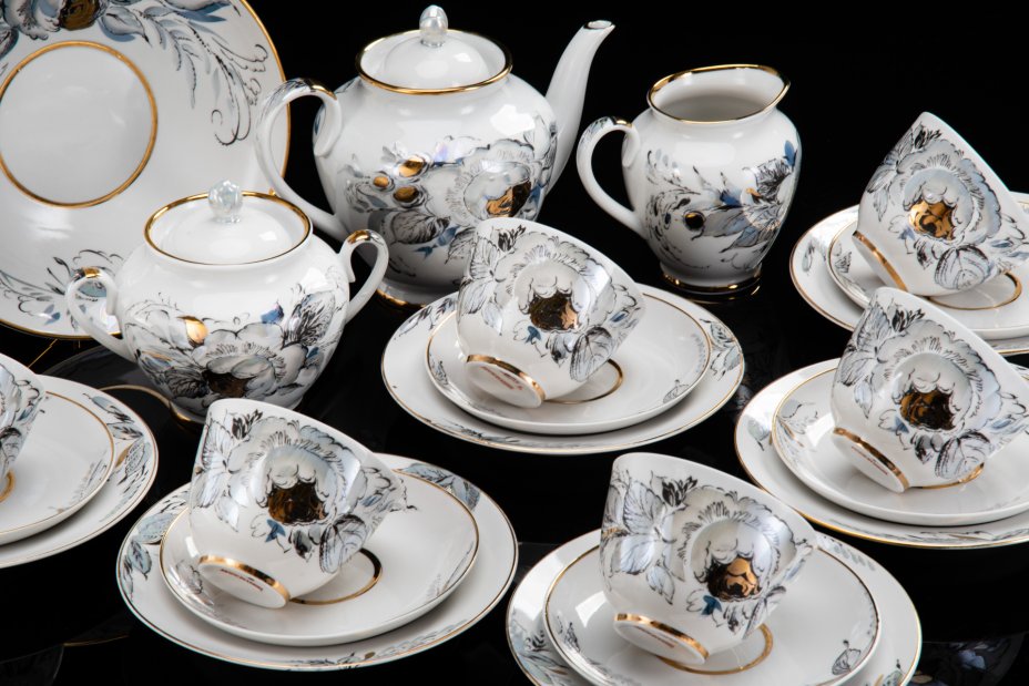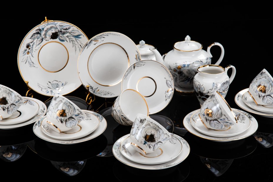 Сервиз чайный "Пионы" на 6 персон (22 предмета), форма "Чайка", автор формы В.Л. Семенов, фарфор, деколь, золочение, Ленинградский фарфоровый завод (ЛФЗ), СССР, 1960-1970 гг.