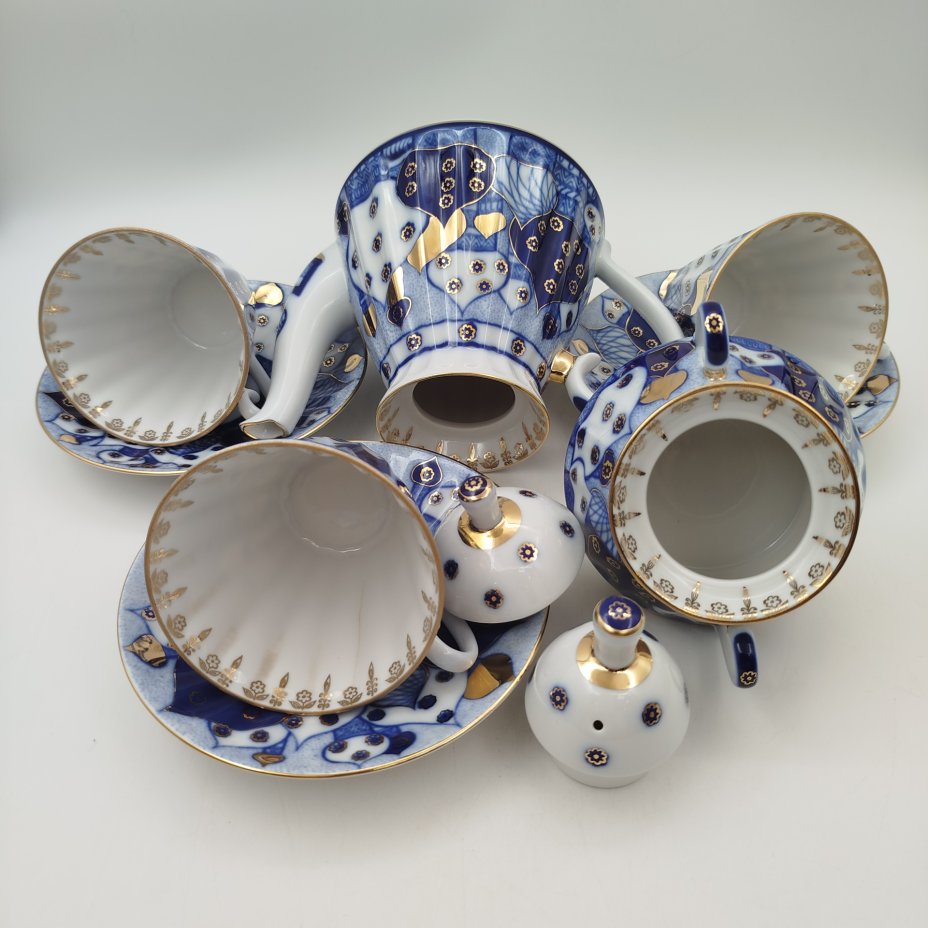 Сервиз чайный "Синие махровые цветы", форма "Репка", на 5 персон (18 предметов), автор формы Яковлева С. Е., автор росписи Беспалова-Михалева Т.Н., фарфор, роспись, золочение, Ленинградский фарфоровый завод (ЛФЗ), СССР, 1950-1960 гг.