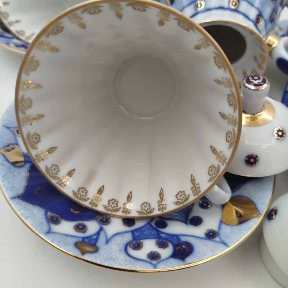 Набор чайных пар на 3 персоны с цветочным декором, фарфор, крытье кобальтом, золочение, Ленинградский фарфоровый завод (ЛФЗ), СССР, 1970-1991 гг.