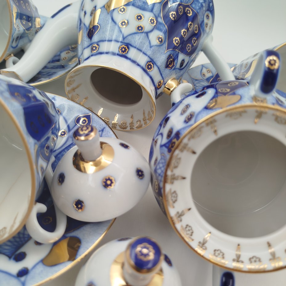 Сервиз "Сарафан" на 5 персон (21 предмет), автор росписи Богданова С. П., форма "Тюльпан", автор формы Яковлева С. Е., фарфор, деколь, золочение, Ленинградский фарфоровый завод (ЛФЗ), СССР, 1970-1991 гг.
