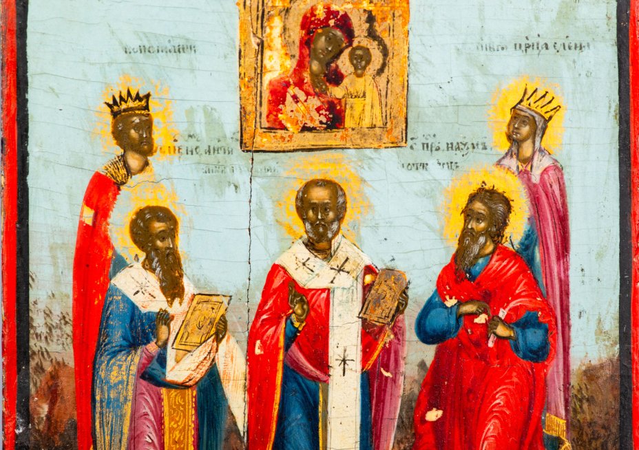 Икона "Избранные святые перед Казанского Богородицы: Св. равноапостольные царь Константин и царица Елена, Св. Антип, Св. Николай Чудотворец, Св. прп. Наум), дерево, темпера, Российская империя, 1880-1915 гг.
