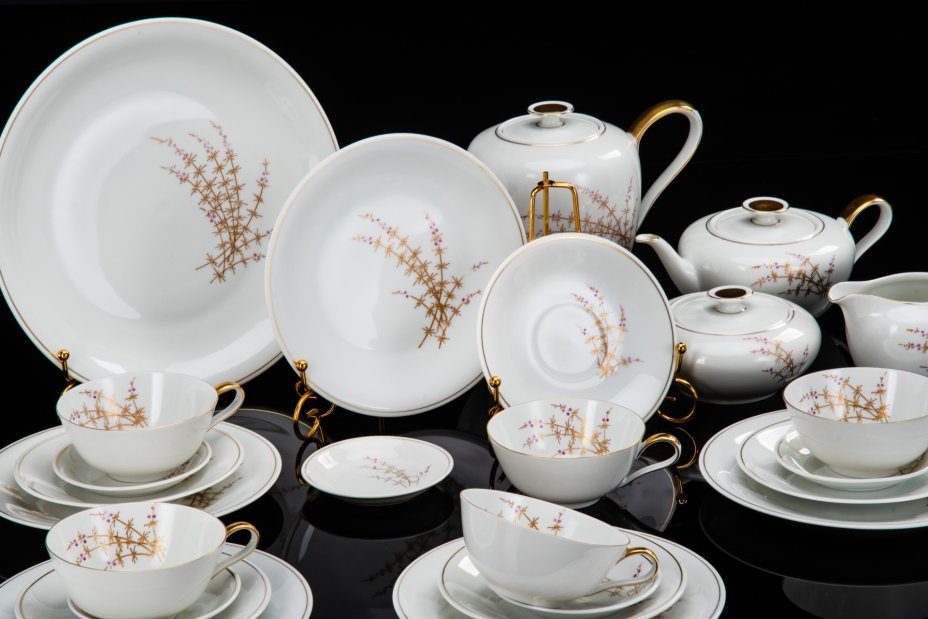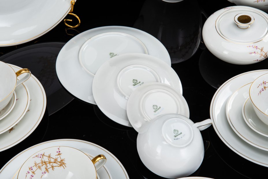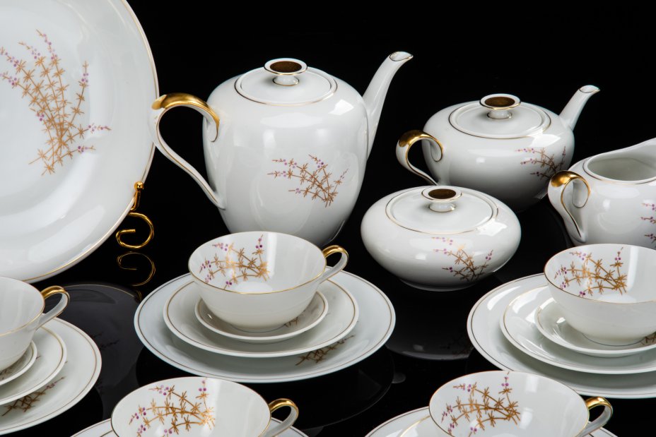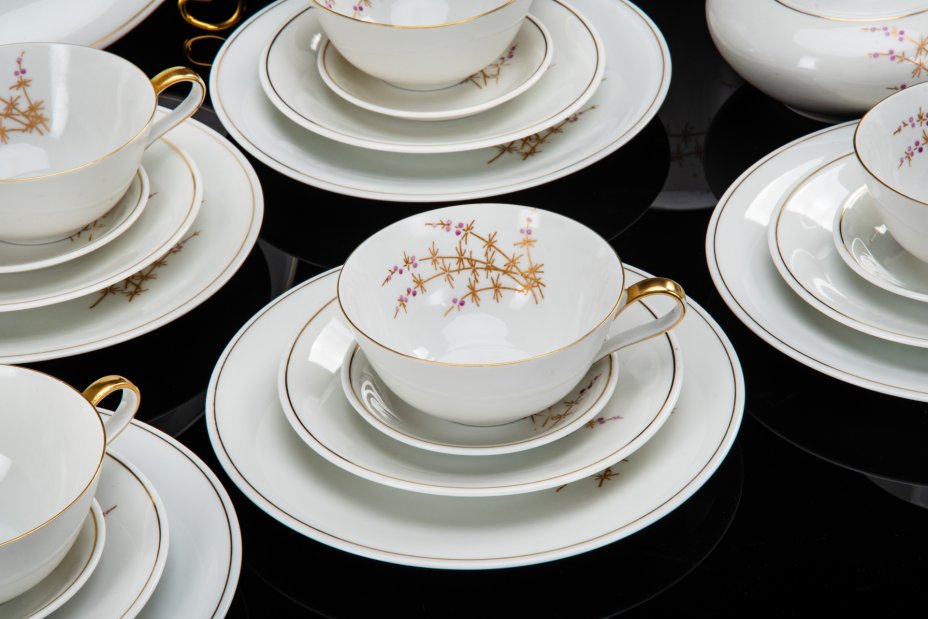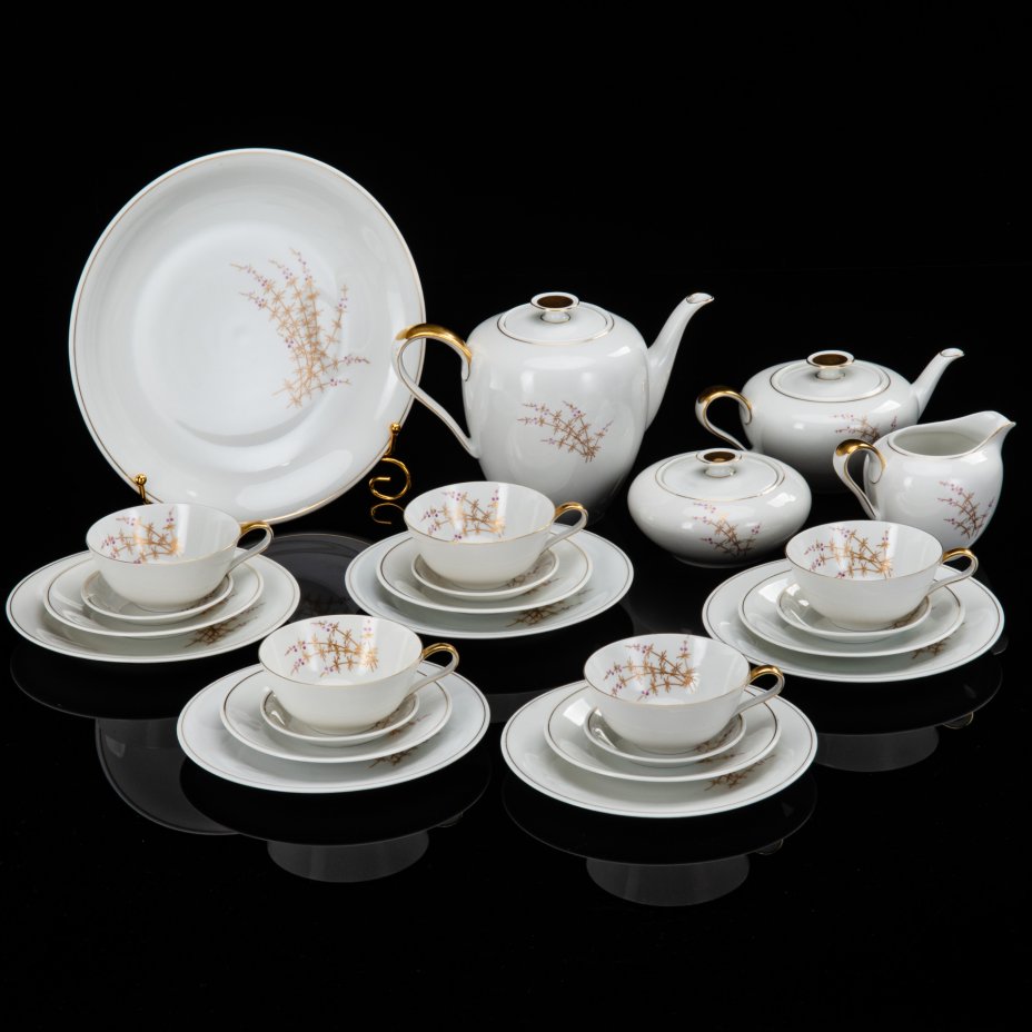 Сервиз чайный с цветочным декором, серия "Eleganz" на 5 персон (25 предметов), фарфор, деколь, золочение, Weimar Porzellan (Веймарский фарфор), ГДР, 1949-1980 гг.