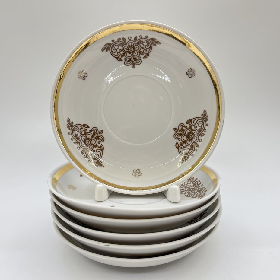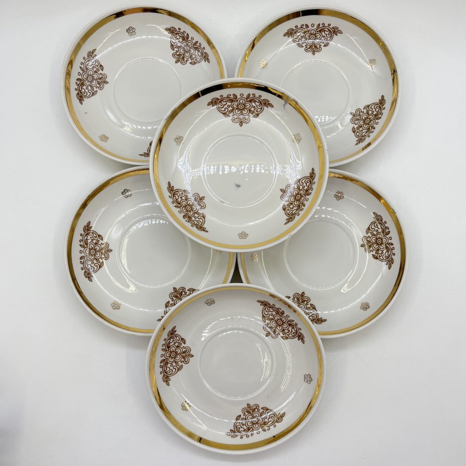Набор чайных пар "Абрикос" на 3 персоны, фарфор, роспись, золочение, Дмитровский фарфоровый завод (ДФЗ Вербилки), СССР, 1954-1965 гг.