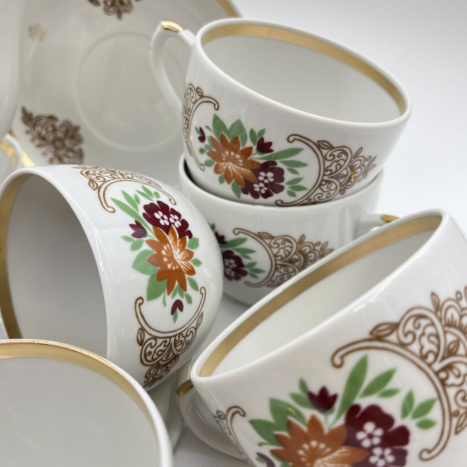 Набор чайный на 5 персон "Маки", автор А.А.Чекулина, фарфор, роспись, золочение, Дмитровский фарфоровый завод (ДФЗ Вербилки), СССР, 1954-1960 гг.
