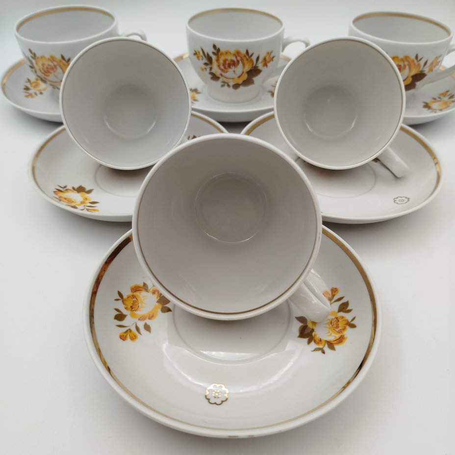 Сервиз чайный с декором в виде жёлтых цветов на 6 персон (15 предметов), фарфор, деколь, золочение, Дмитровский фарфоровый завод (ДФЗ Вербилки), СССР, 1965-1991 гг.