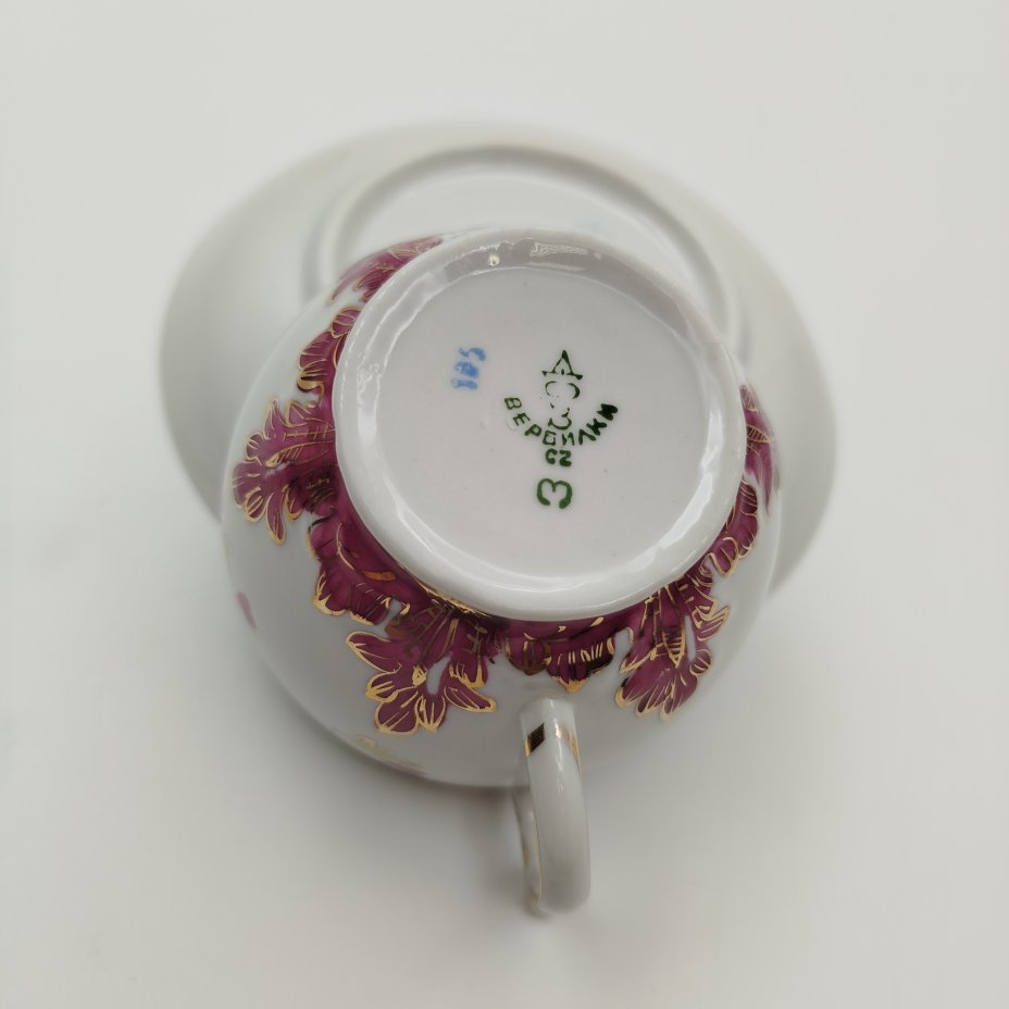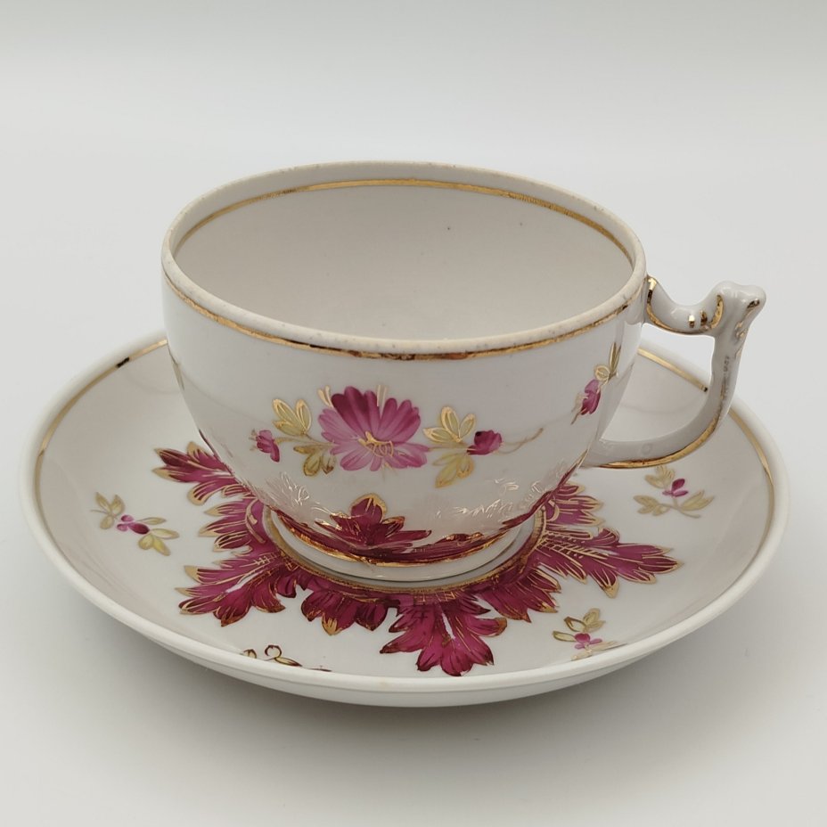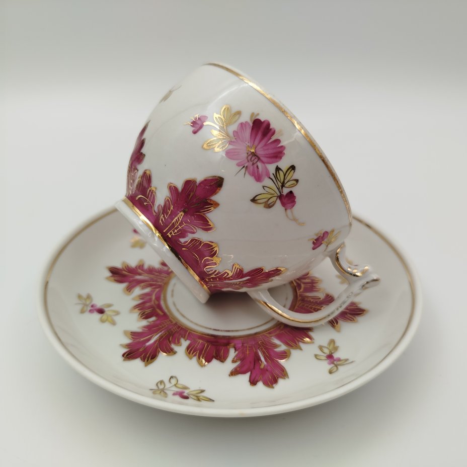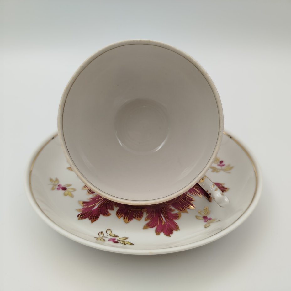Пара чайная "Барбарис" в пурпурном оттенке, автор Е.П. Смирнов, фарфор, роспись, золочение, Дмитровский фарфоровый завод (ДФЗ Вербилки), СССР, 1954-1965 гг.