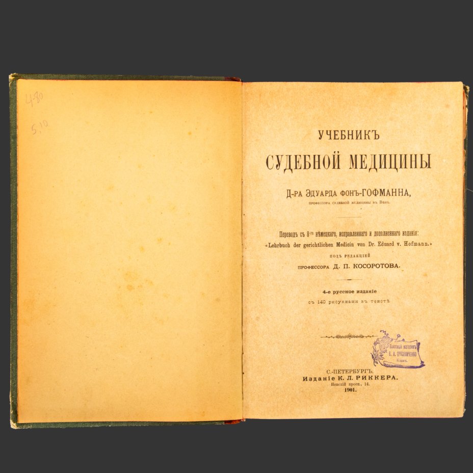 Книга, Доктор Эдуард Фон Гофманн, "Учебник Судебной Медицины", Издание К.Л. Риккера, бумага, печать, кожа, тиснение, коленкор, Российская империя, 1901 г.