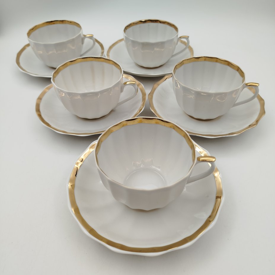 Чайно-кофейный сервиз на 5 персон (12 предметов), фарфор, деколь, золочение, Дмитровский фарфоровый завод (ДФЗ Вербилки), СССР, 1954-1965 гг.