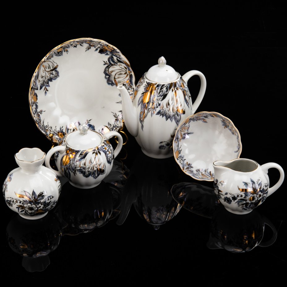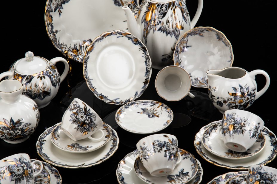 Сервиз кофейный на 6 персон цвета слоновой кости с декором в виде голубых цветов (предметов), фарфор, деколь, золочение, Bernadotte, Чехословакия, 1960-1990 гг.