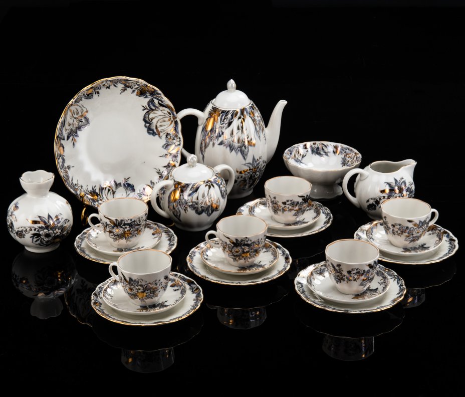 Набор кофейных трио "Золотой сад" на 6 персон, автор формы "Тюльпан" С.Е. Яковлева, автор рисунка Н.П. Славина, фарфор, деколь, золочение, Ленинградский фарфоровый завод (ЛФЗ), СССР, 1970-1992 гг.