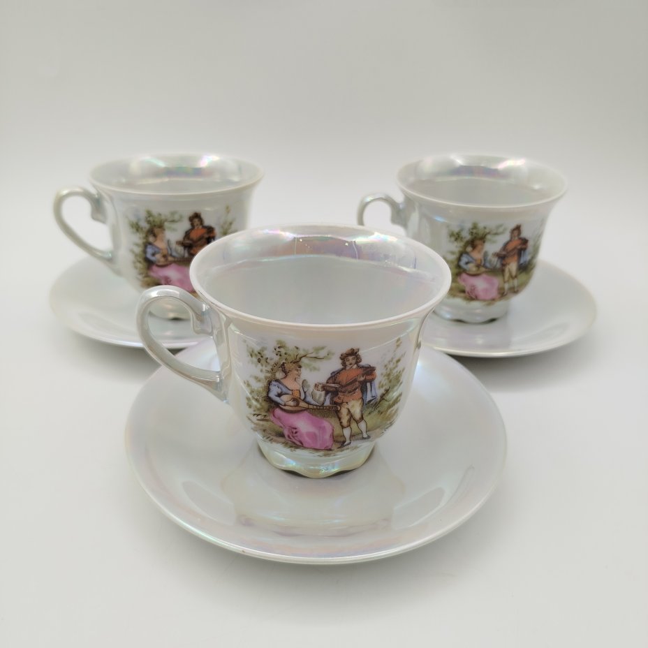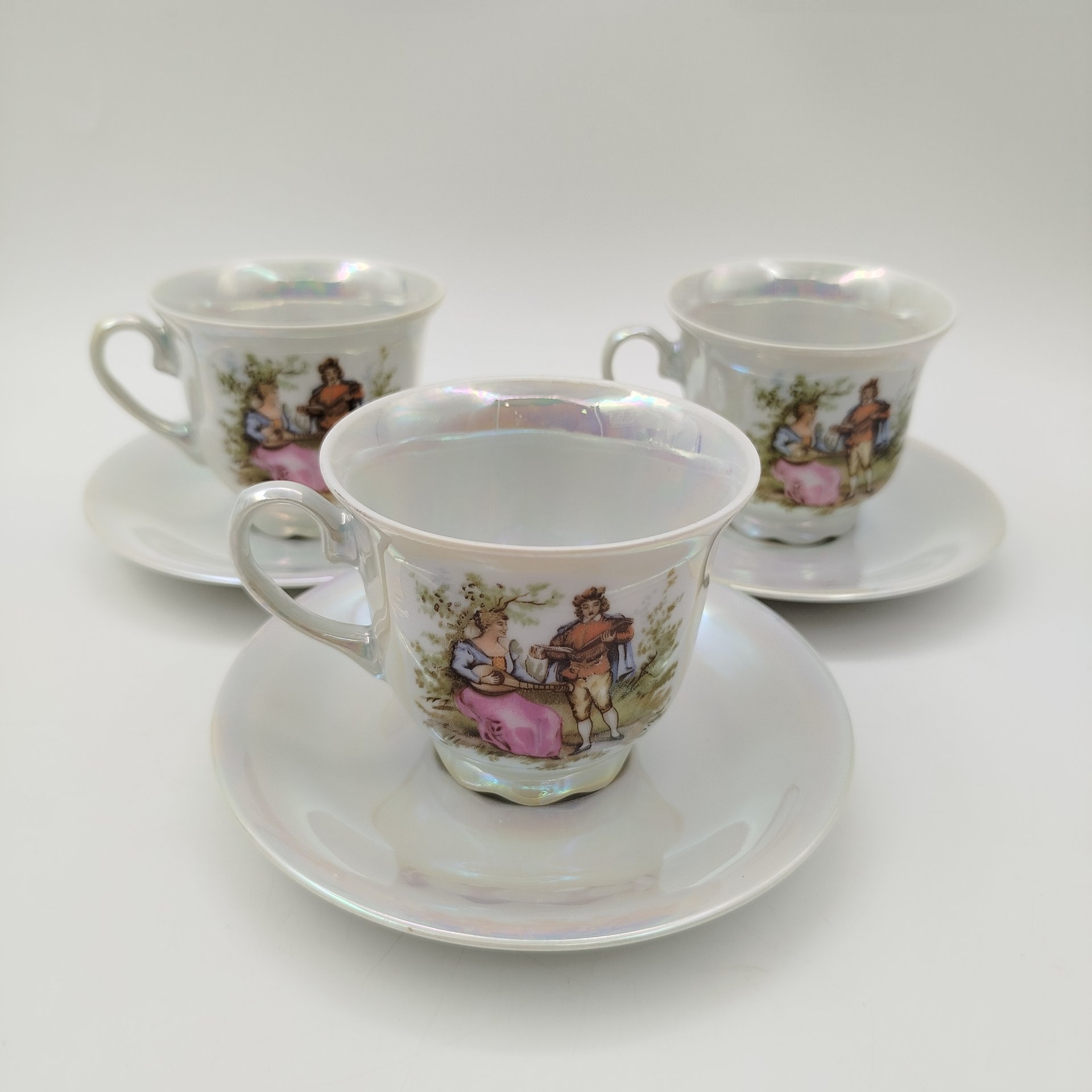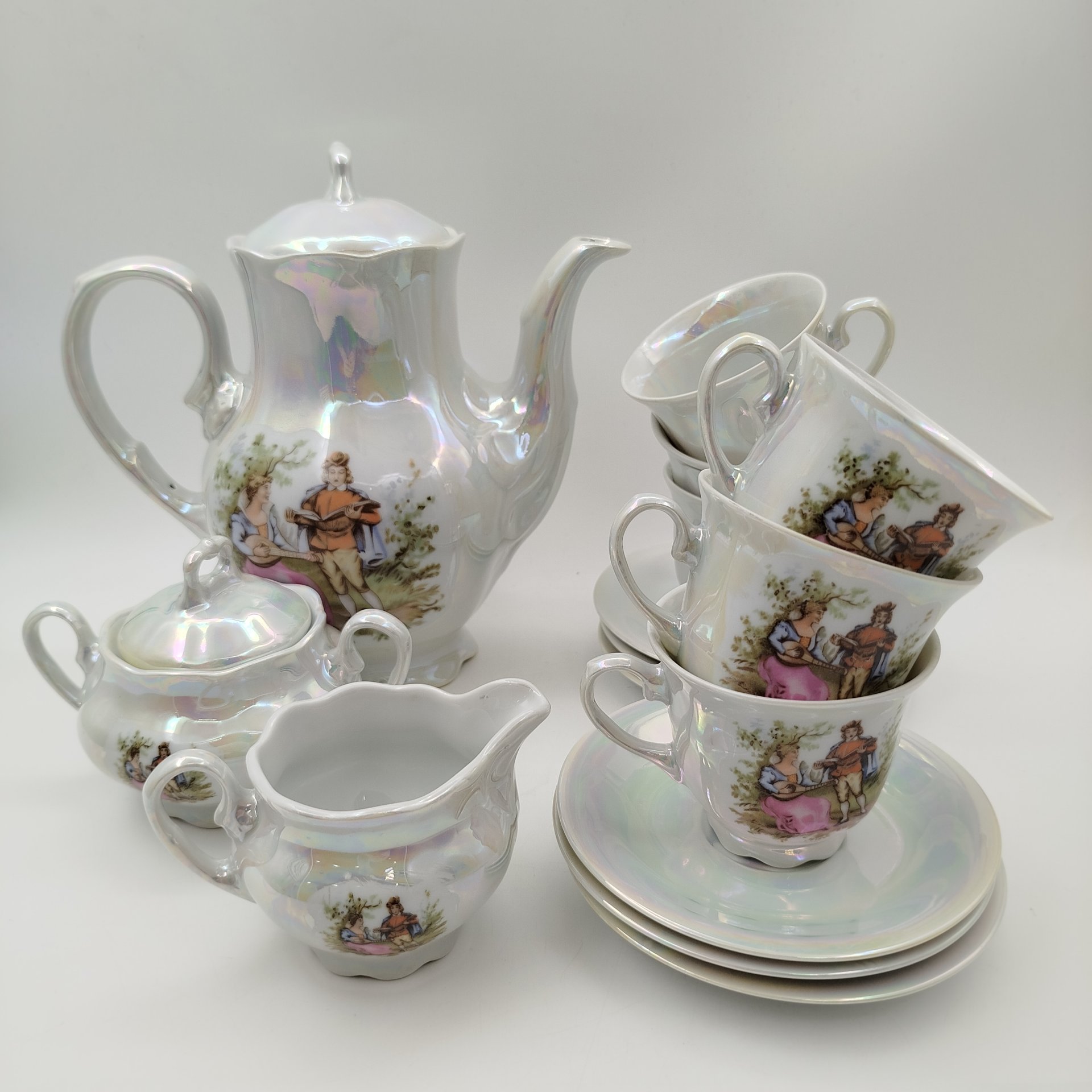 Сервиз кофейный на 6 персон, украшенный изображением галантных сцен (15 предметов), фарфор, люстр, деколь, золочение, FP Zajecar, Югославия, 1970-1991 гг.
