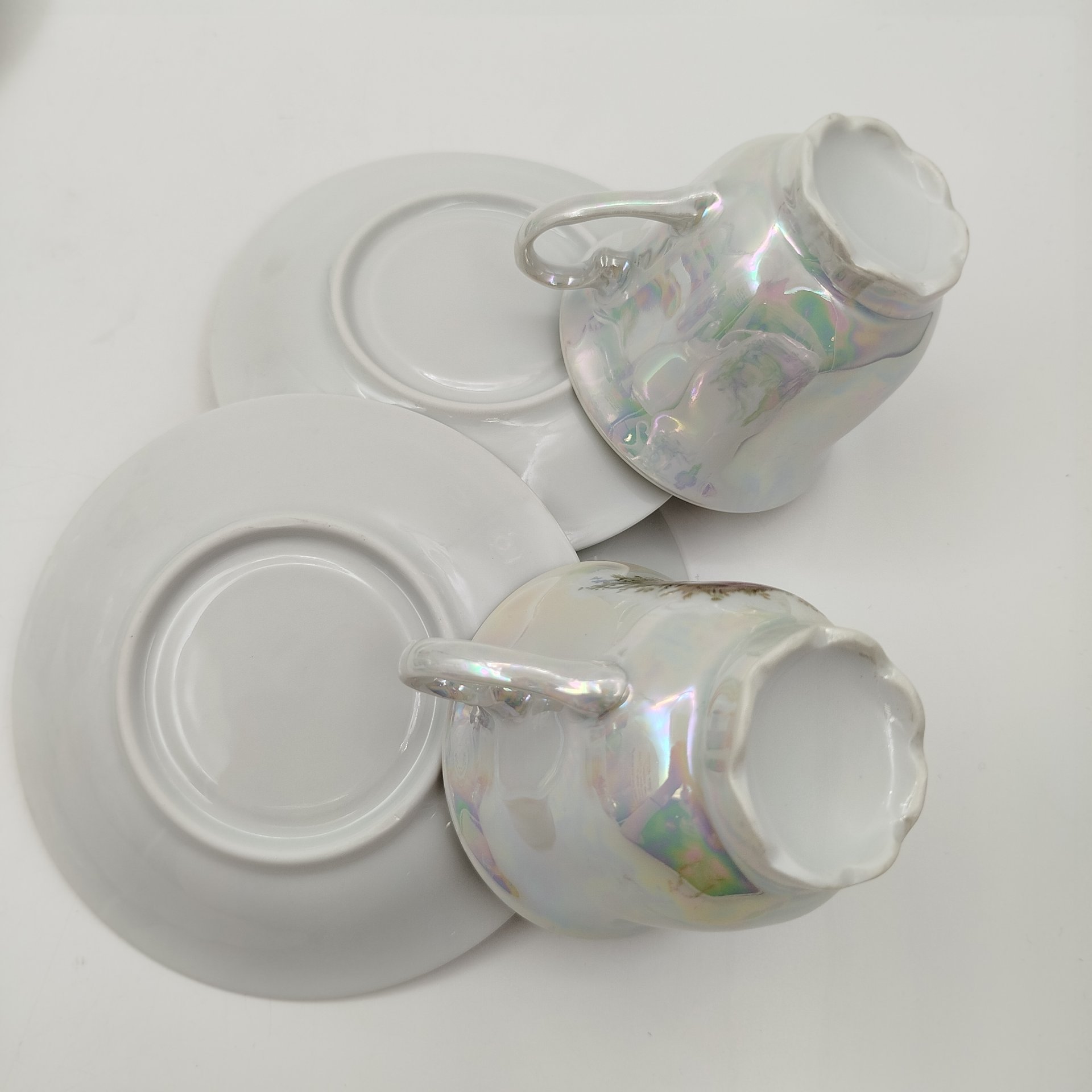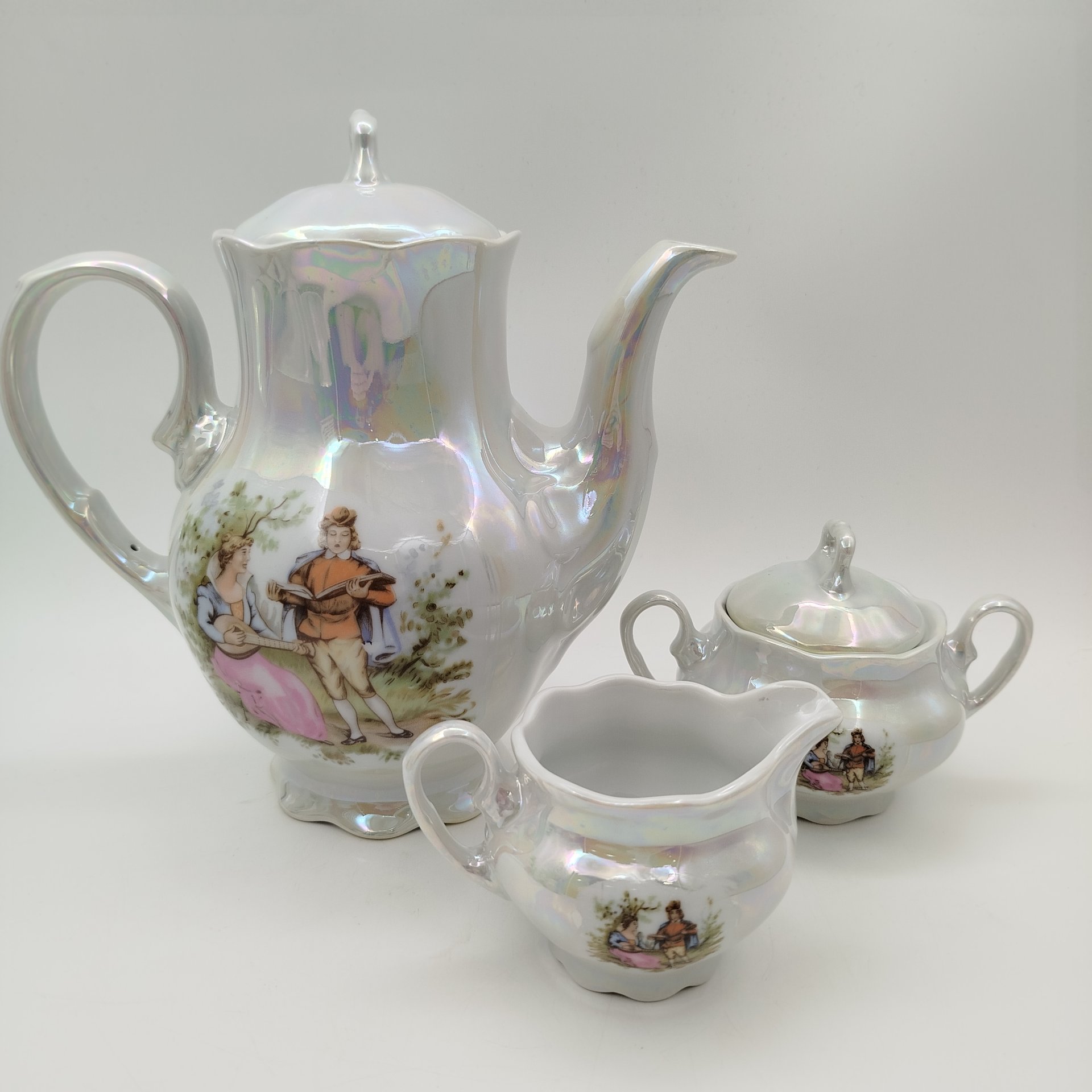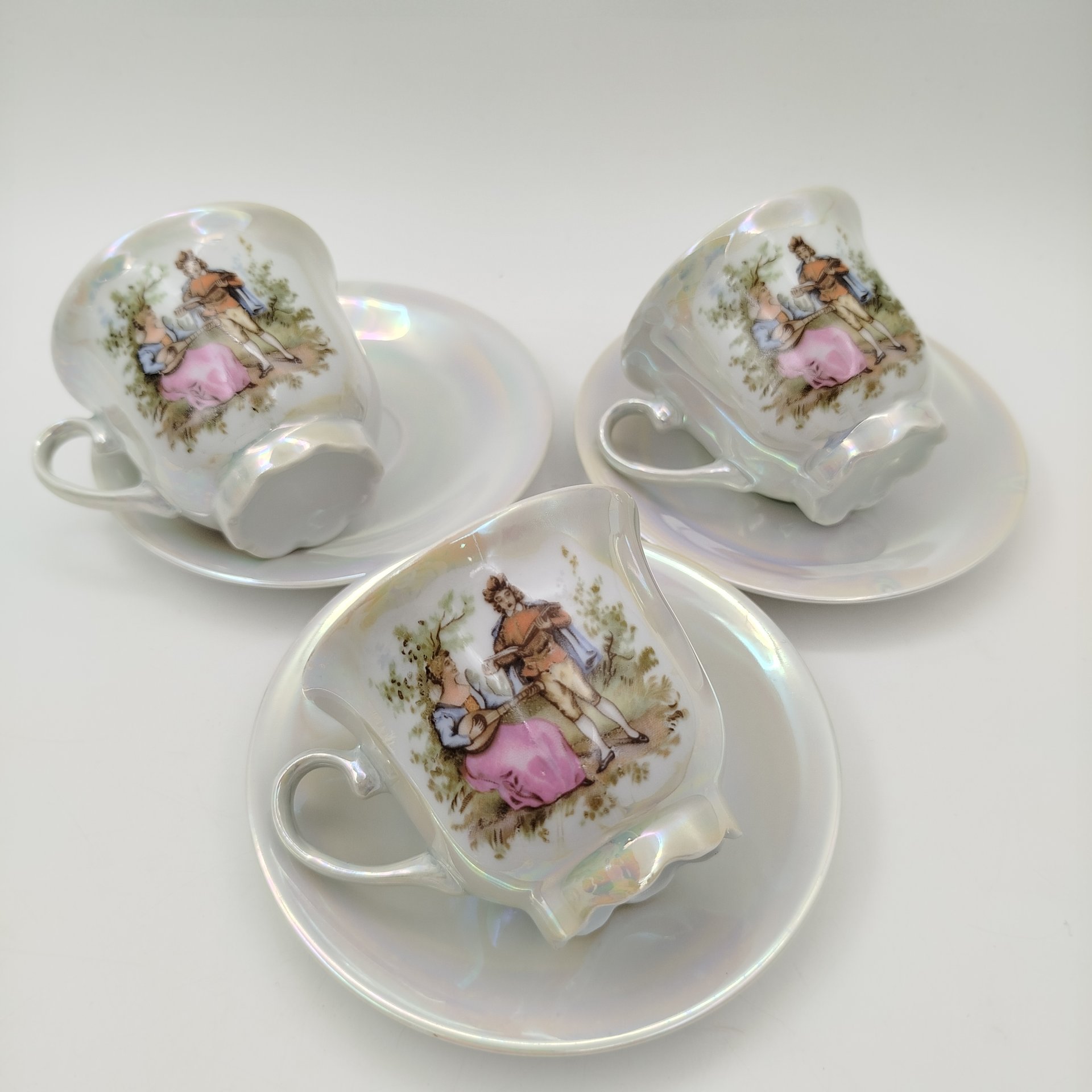 Сервиз кофейный на 6 персон, украшенный изображением галантных сцен (15 предметов), фарфор, люстр, деколь, золочение, FP Zajecar, Югославия, 1970-1991 гг.
