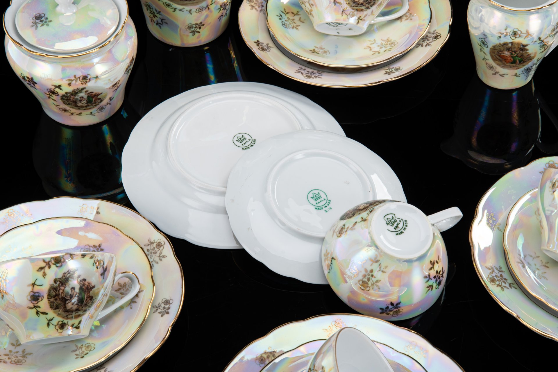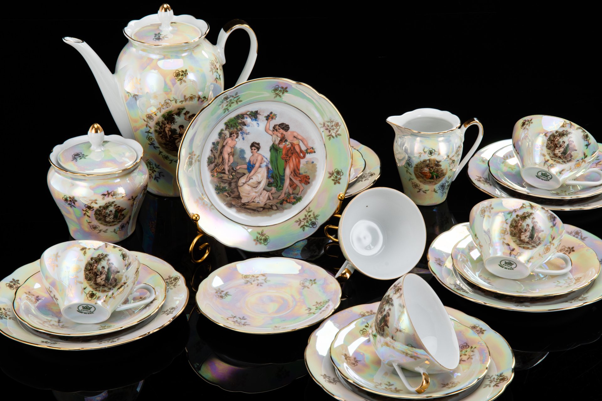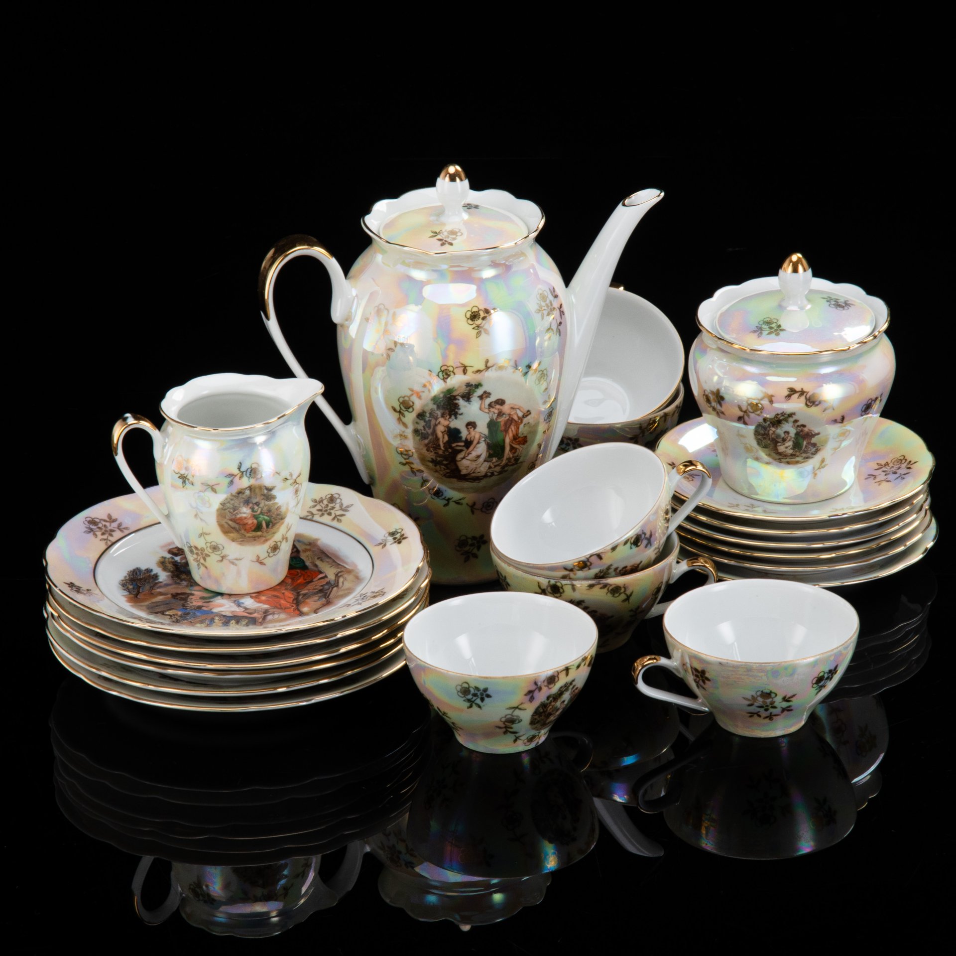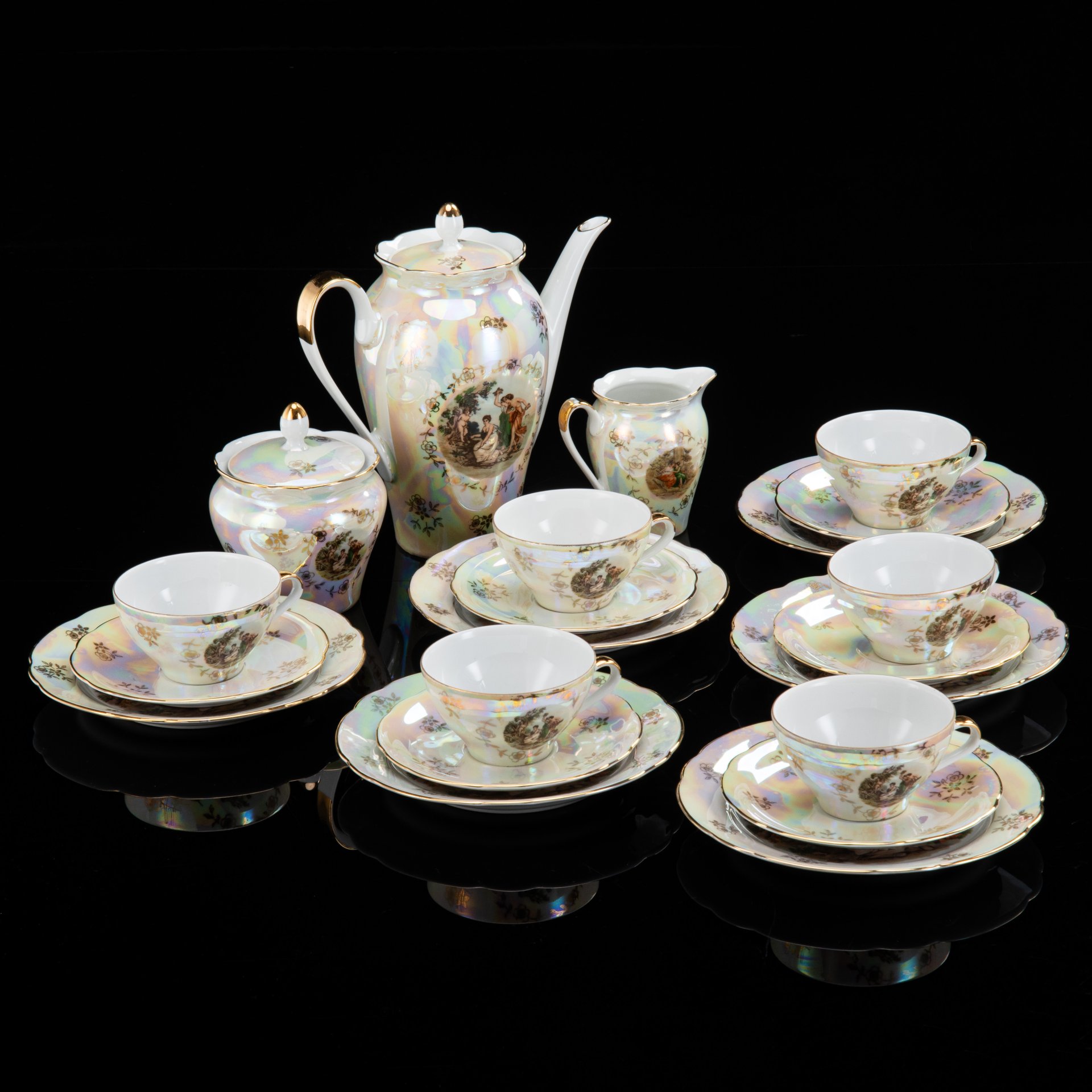 Кофейный музыкальный сервиз на 6 персон (15 предметов), фарфор, металл, деколь, золочение, Япония, 1980-1990 гг.