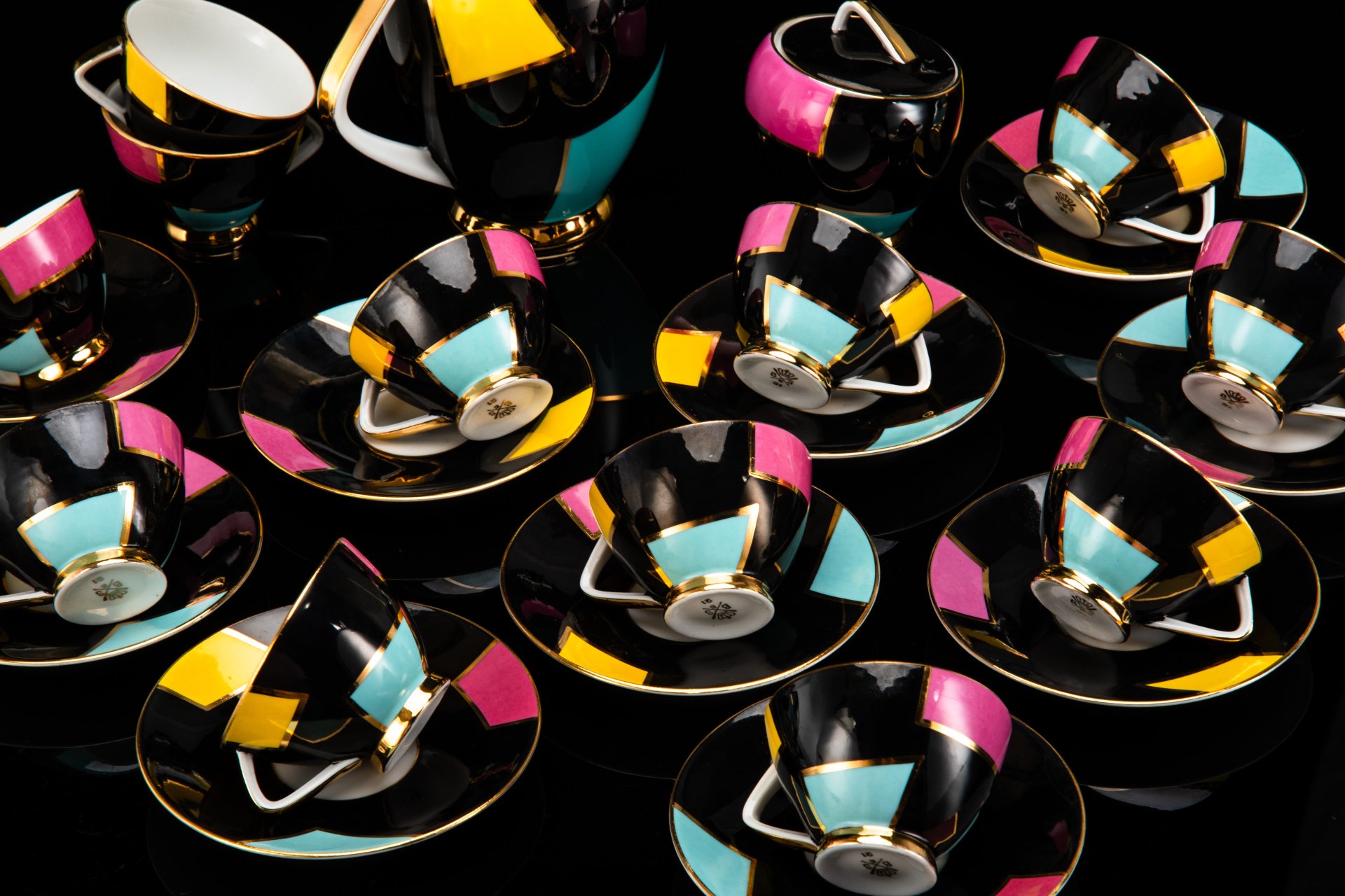 Сервиз кофейный с геометрическим декором, на 4 персонs (10 предметов), фарфор, деколь, золочение, Freiberg Porzellan, ГДР, 1957-1972 гг.