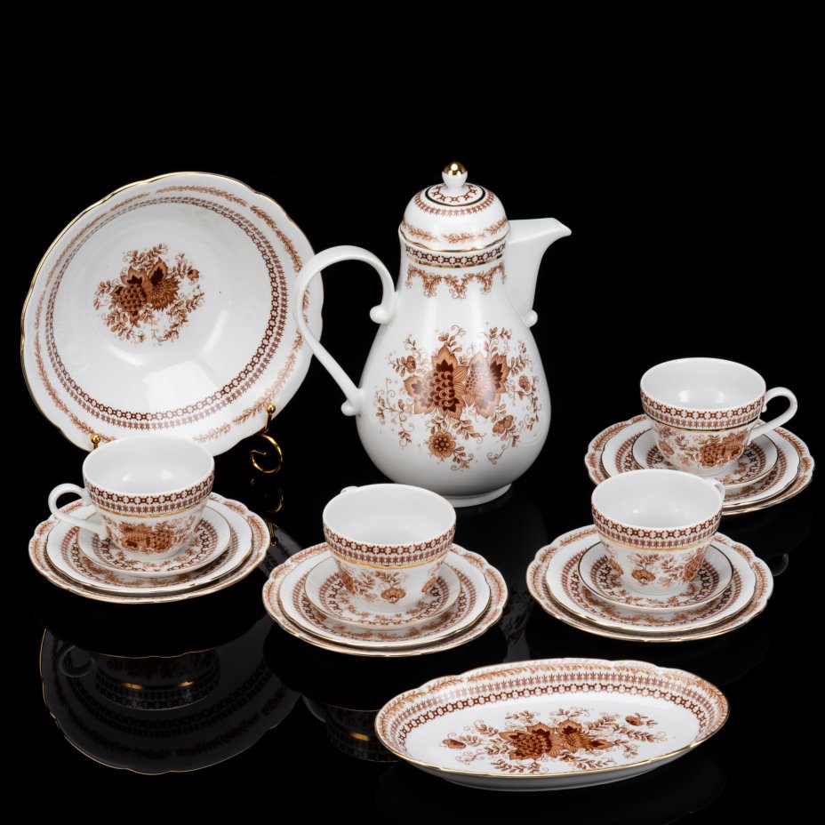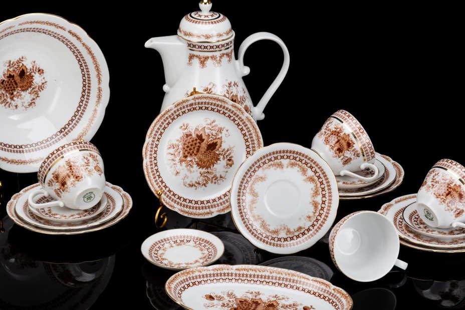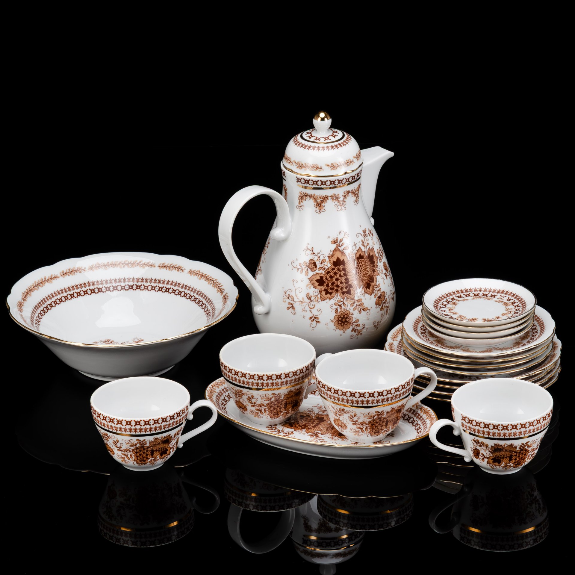 Кофейный сервиз "Флора" на 6 персон (15 предметов), фарфор, деколь, люстр, золочение, Kahla, ГДР, 1968-1987 гг.
