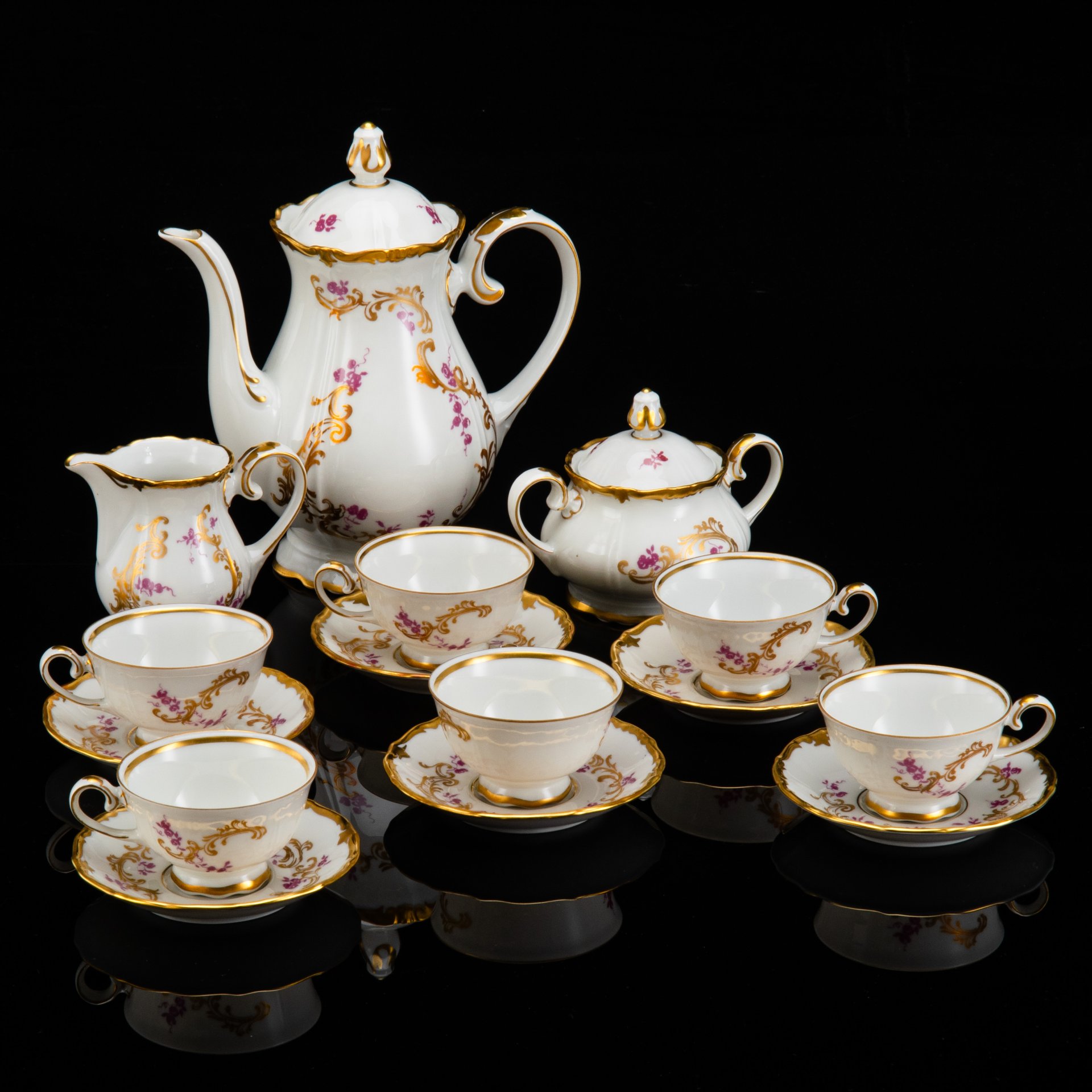 Сервиз кофейный с цветочным декором на 4 персоны (15 предметов), фарфор, деколь, золочение, Дмитровский фарфоровый завод (ДФЗ Вербилки), СССР, 1965-1991 гг.