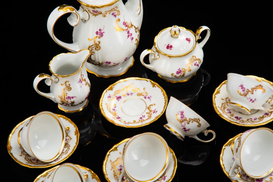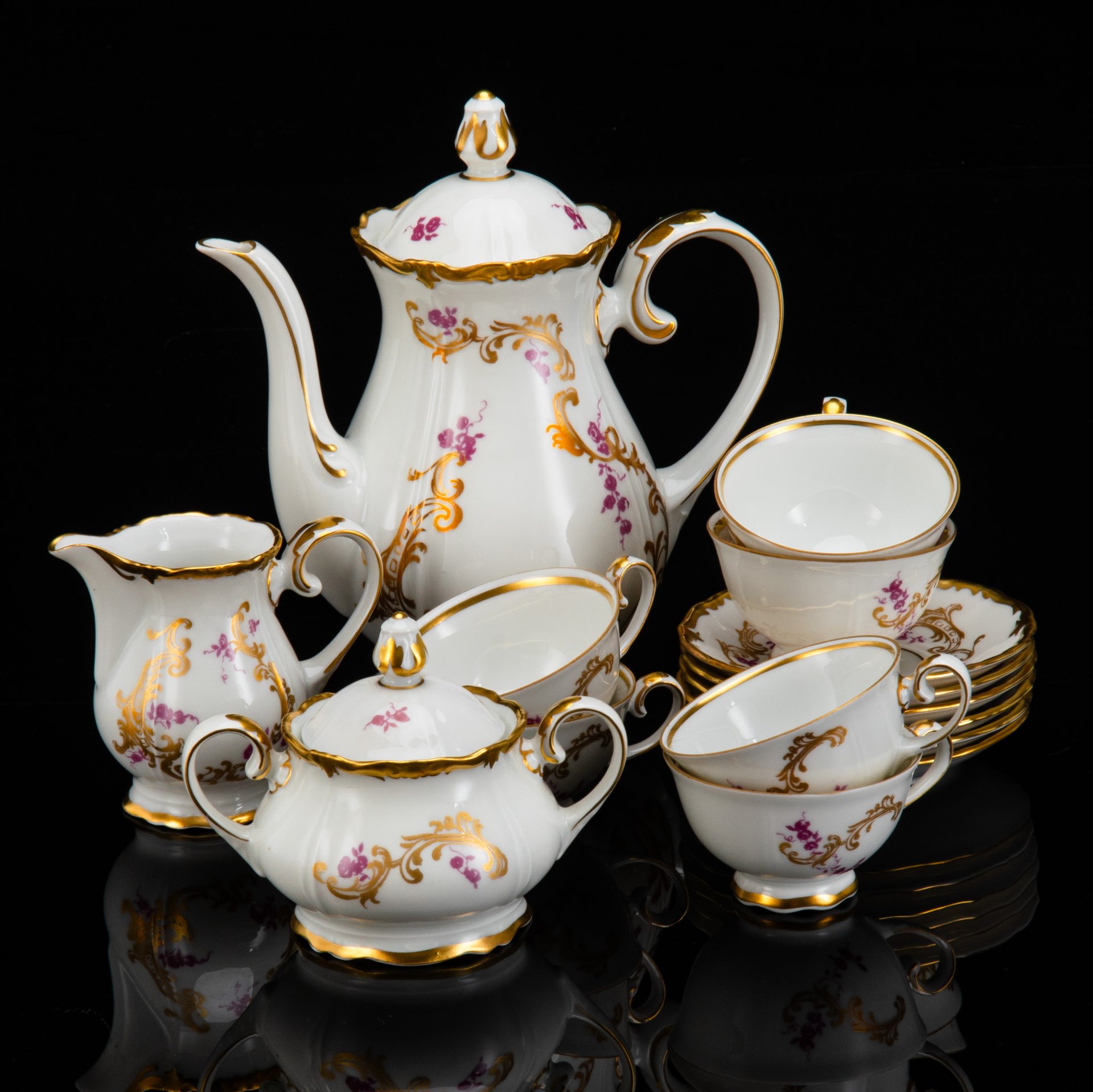 Сервиз кофейный "Фриз" на 6 персон (21 предмет), фарфор, деколь, золочение, Ленинградский фарфоровый завод (ЛФЗ), СССР, 1970-1991 гг.