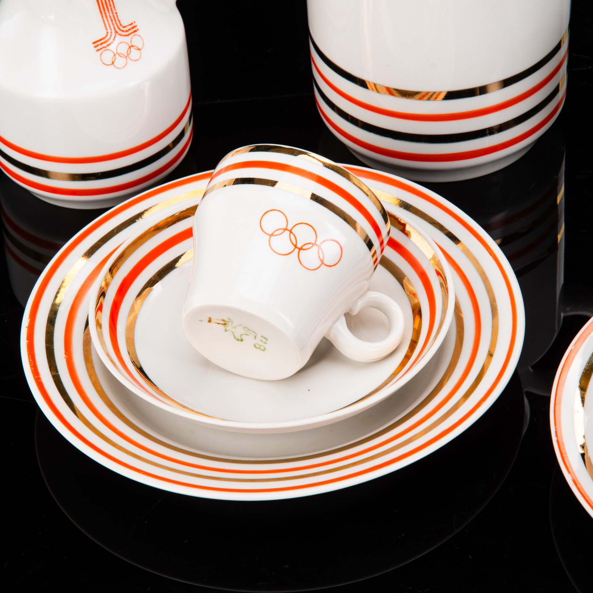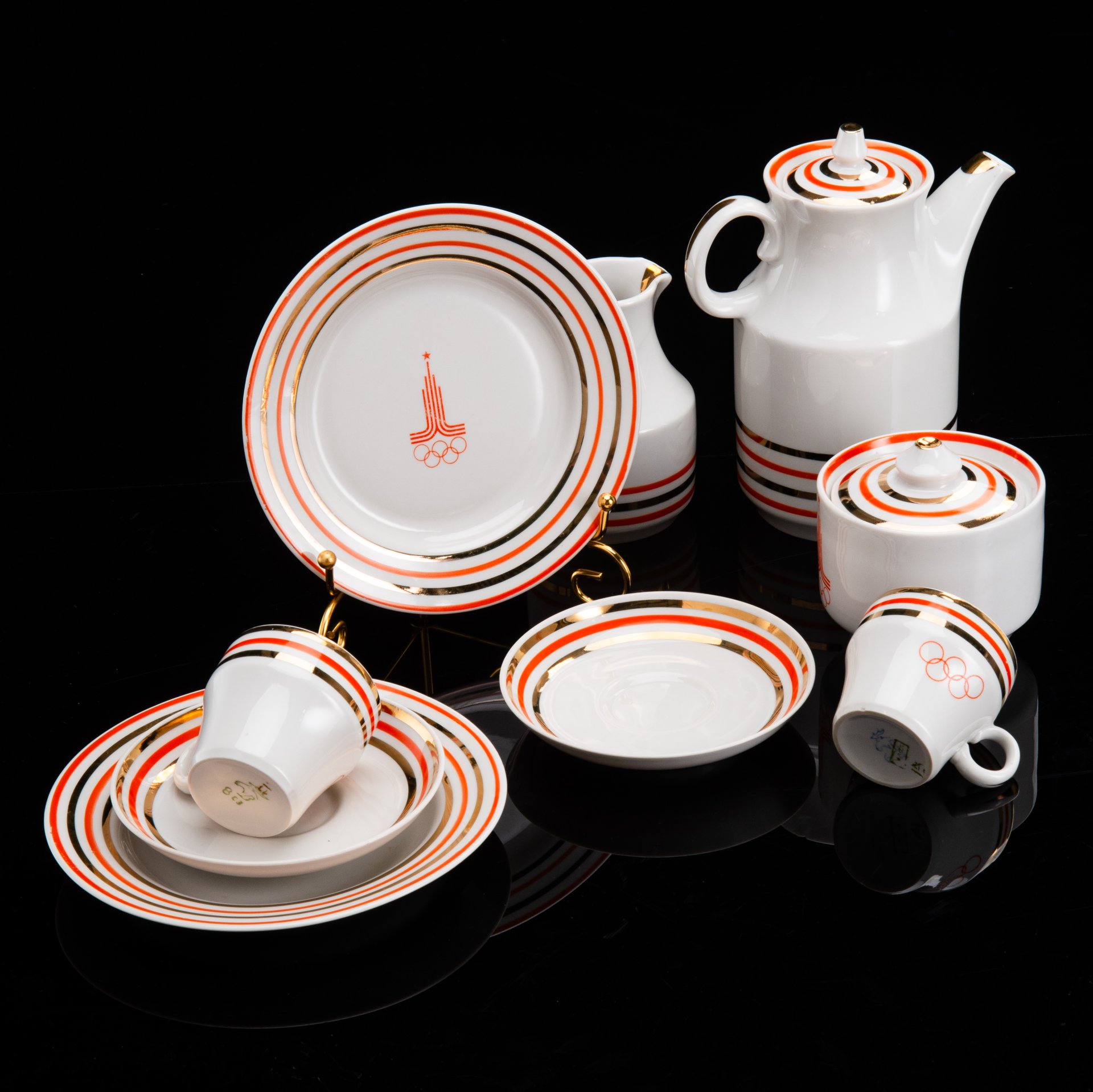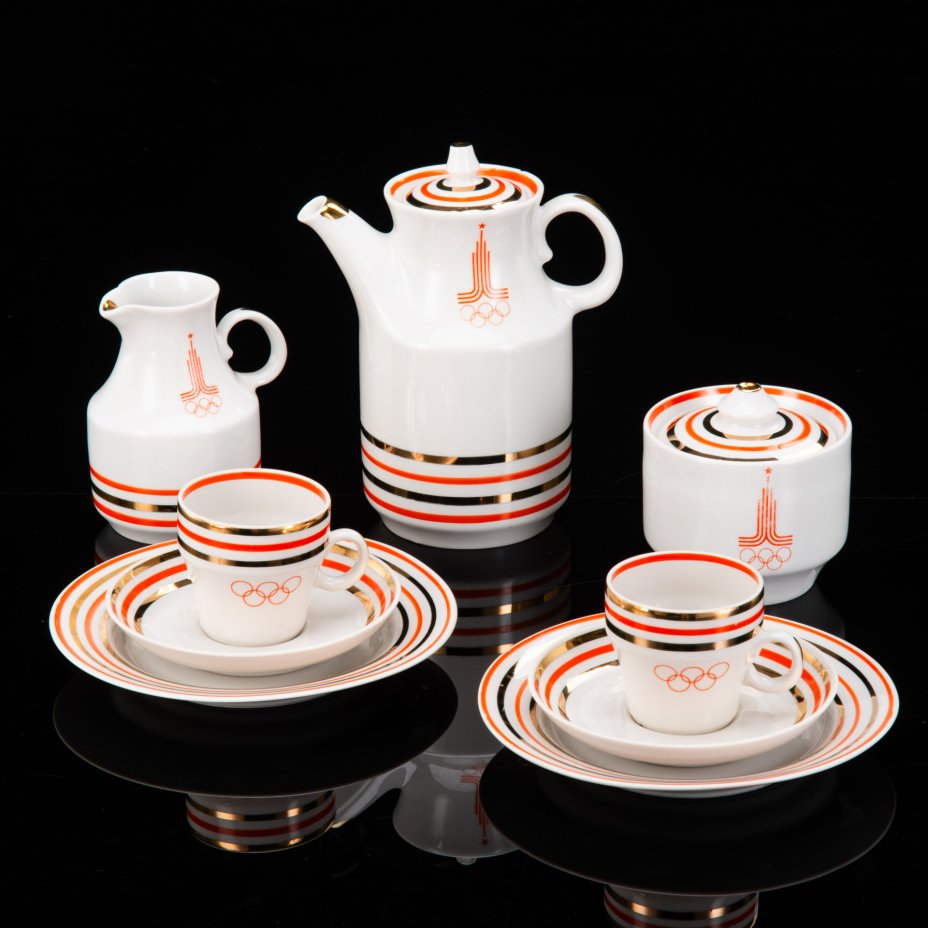 Кофейный музыкальный сервиз на 6 персон (15 предметов), фарфор, металл, деколь, золочение, Япония, 1980-1990 гг.