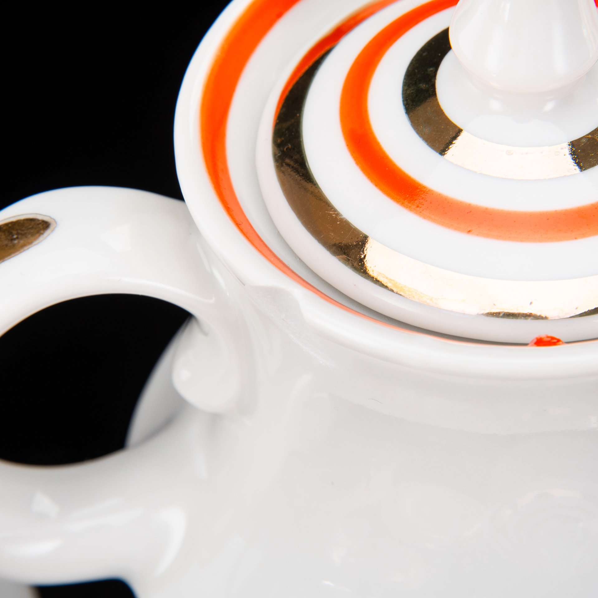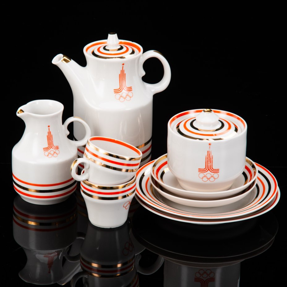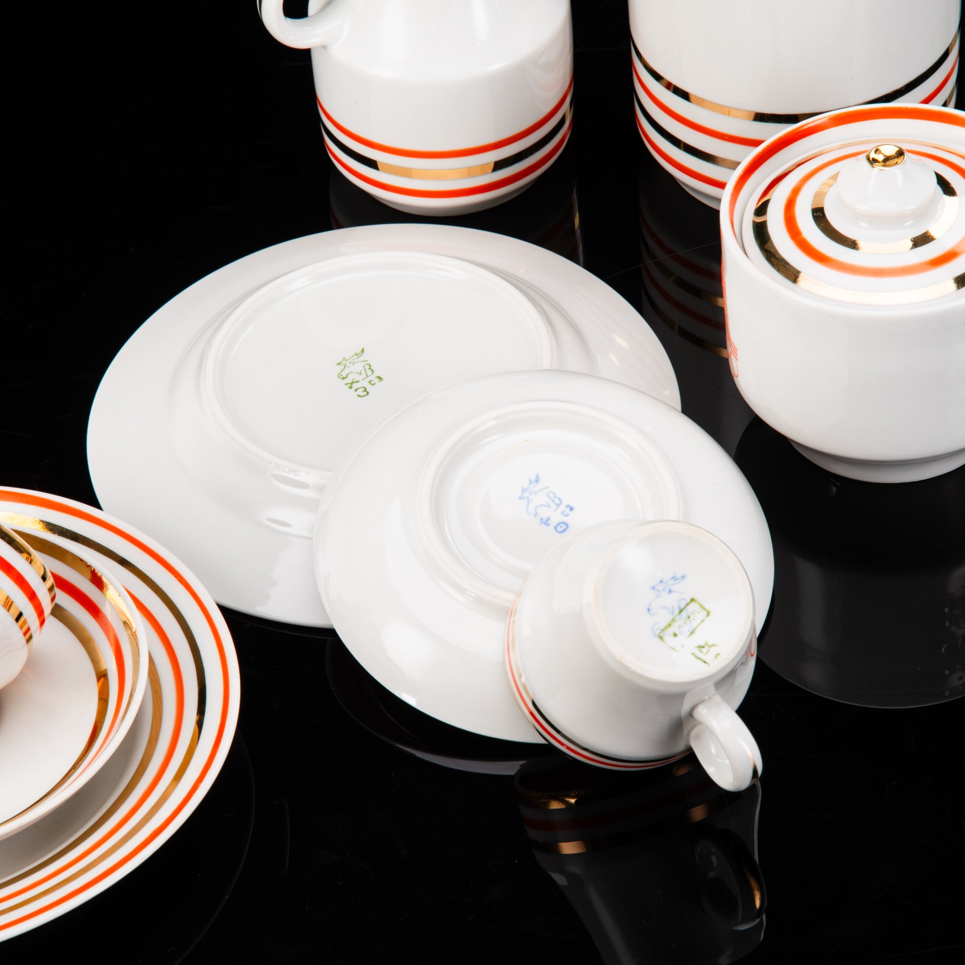 Сервиз кофейный в красно-белой гамме на 6 персон (15 предметов), фарфор, крытье, золочение, Kahla, ГДР, 1960-1990 гг.