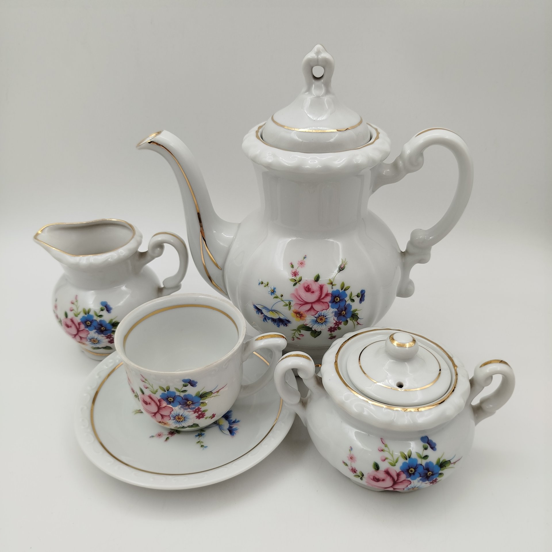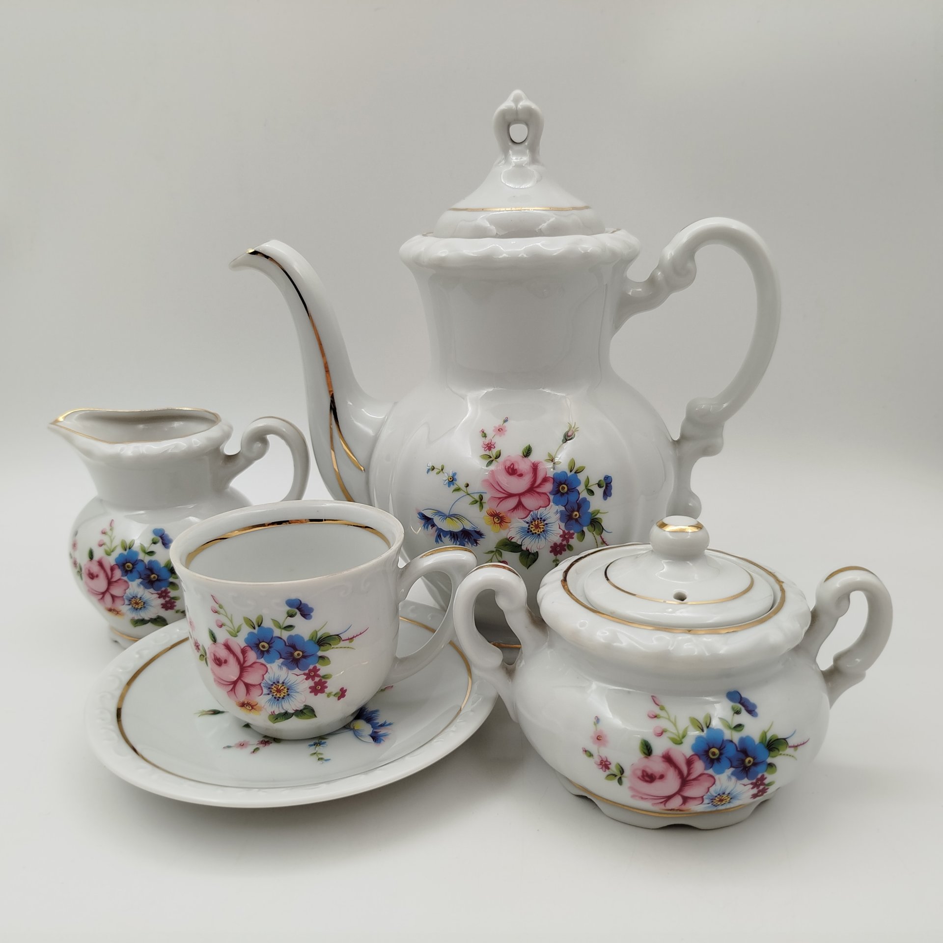 Сервиз кофейный на 6 персон цвета слоновой кости с декором в виде голубых цветов (предметов), фарфор, деколь, золочение, Bernadotte, Чехословакия, 1960-1990 гг.