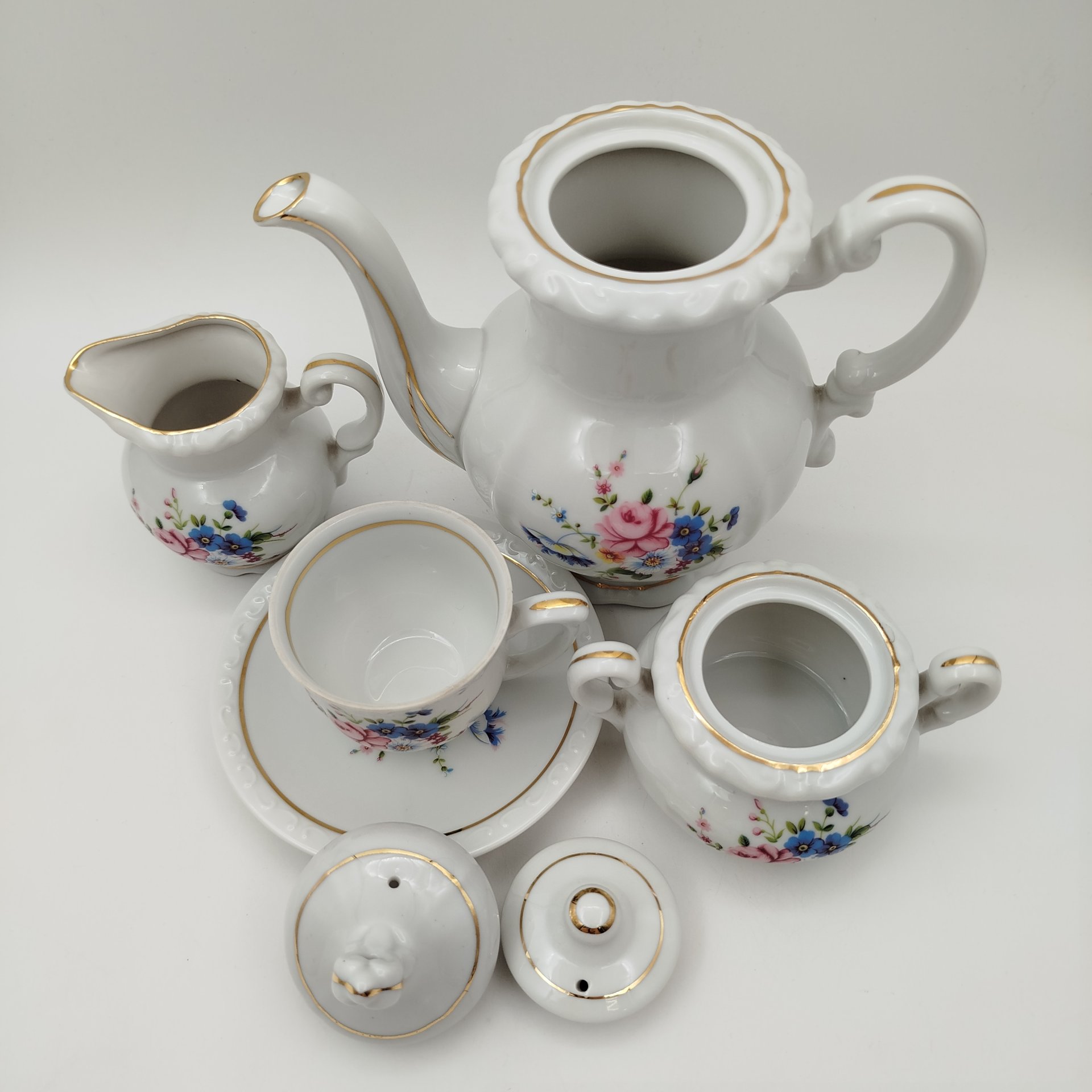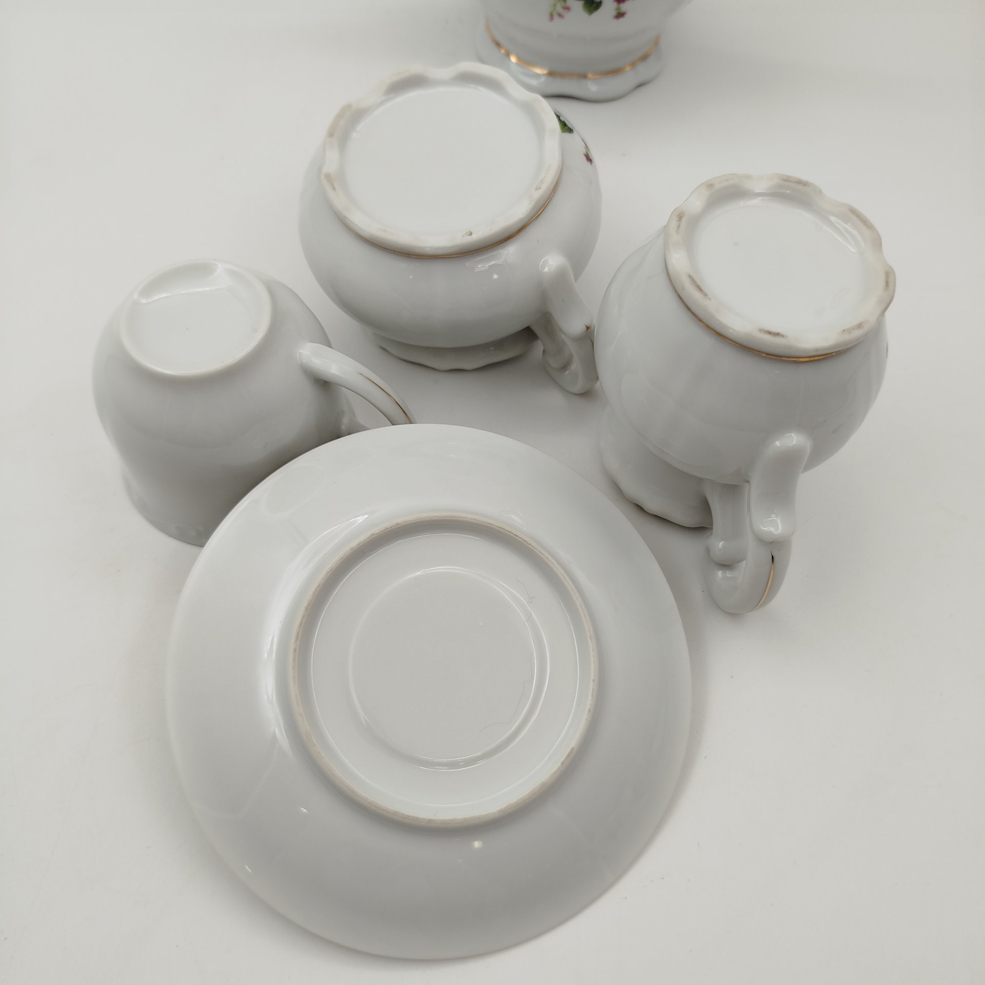 Сервиз кофейный с цветочным декором в пурпурной гамме на 6 персон (15 предметов), фарфор, деколь, золочение, Colditz (Кольдиц), ГДР, 1960-1990 гг.