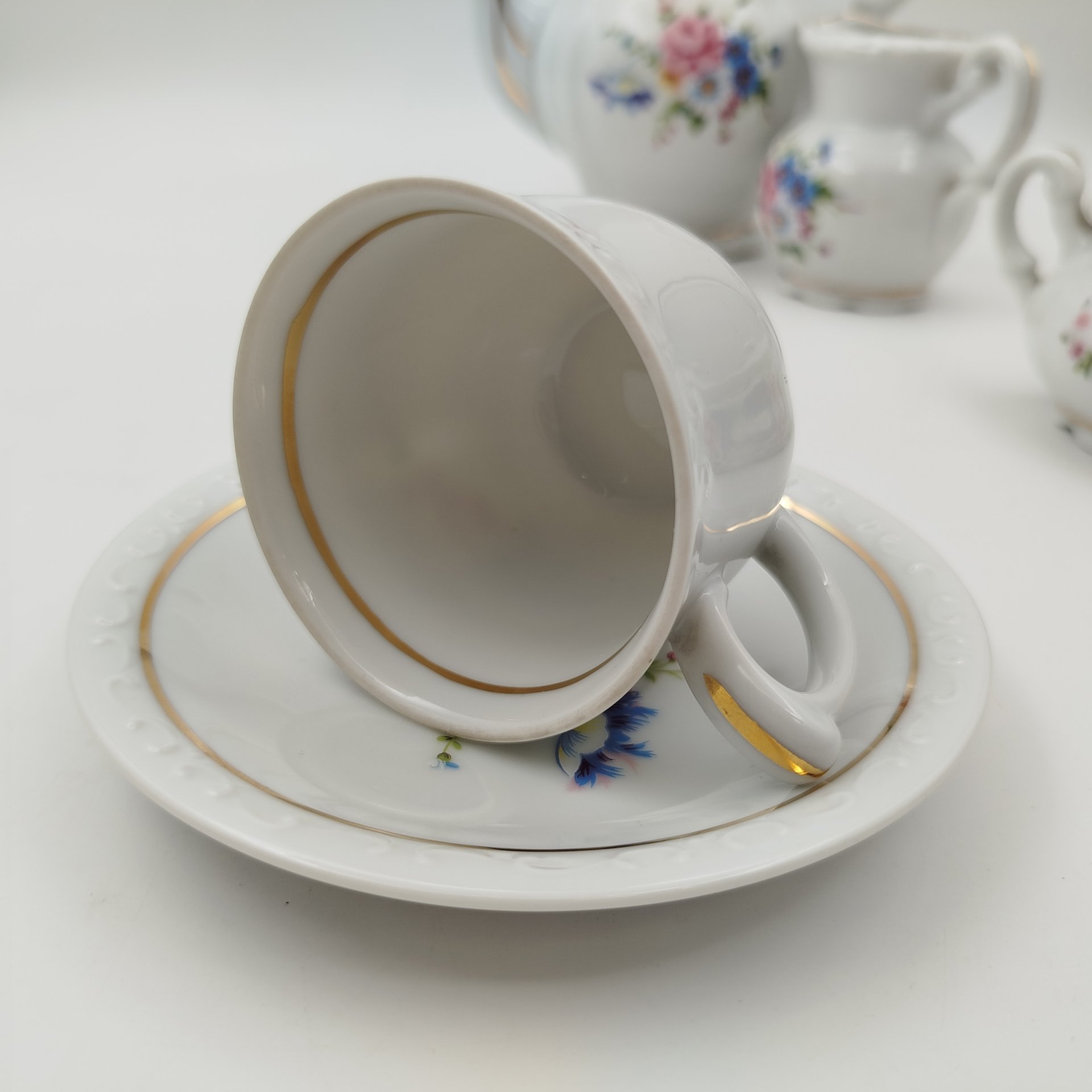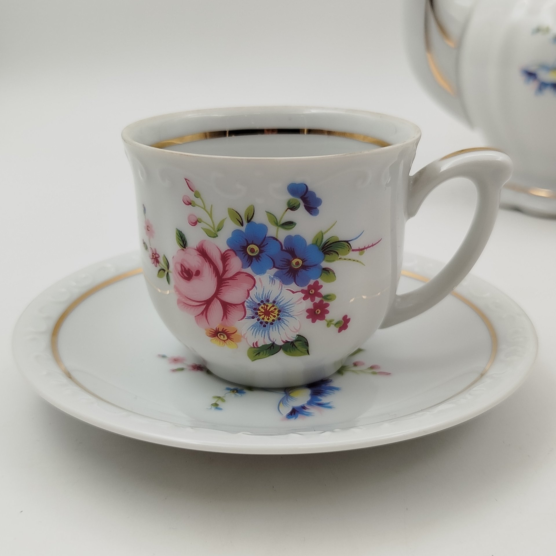 Сервиз кофейный с монохромным цветочным декором на 6 персон (15 предметов), фарфор, деколь, золочение, Kahla, ГДР, 1960-1990 гг.