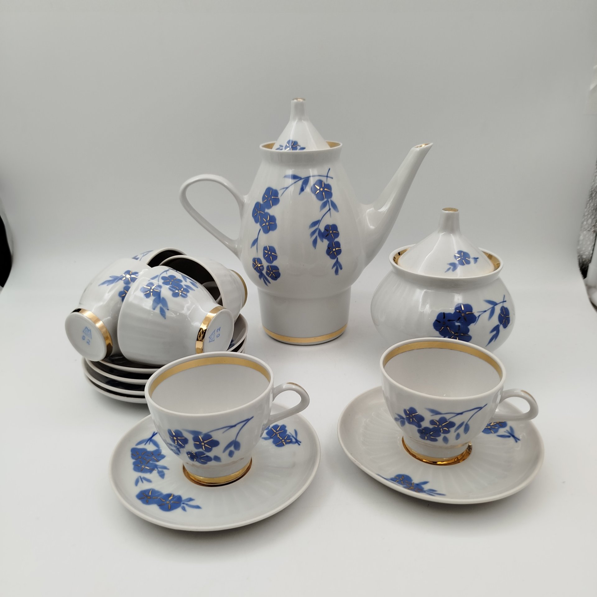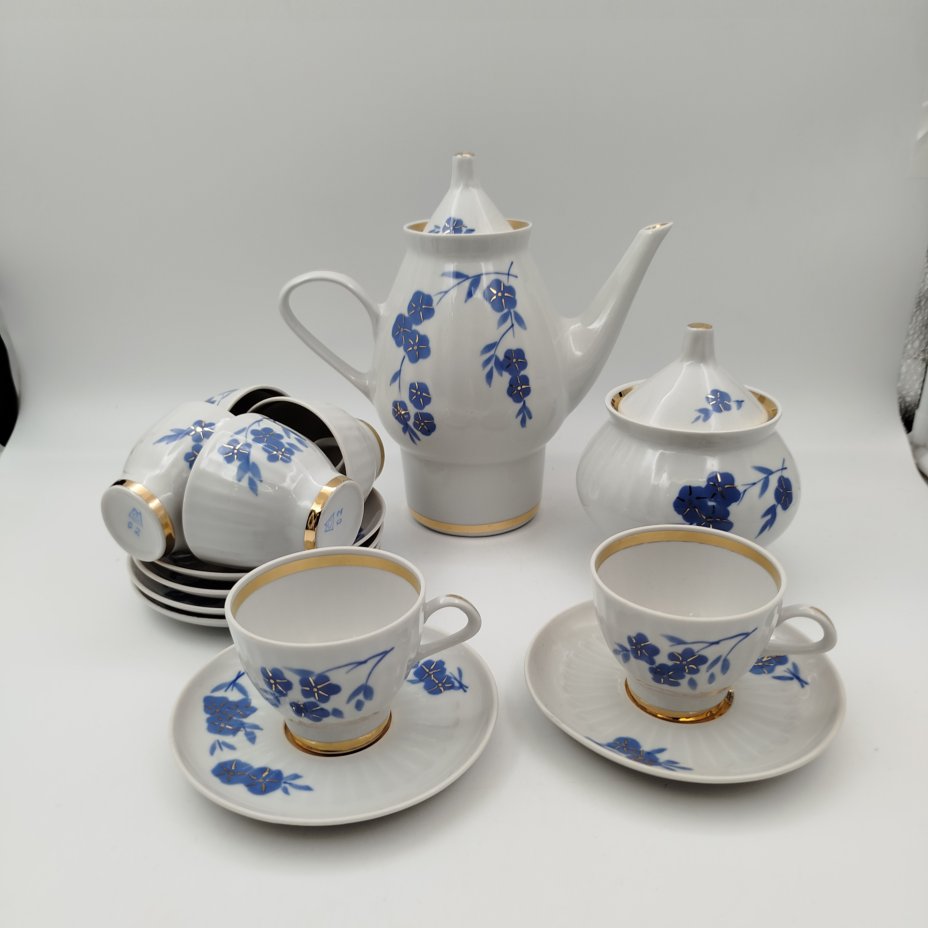 Сервиз кофейный на 6 персон (14 предметов), украшенный цветами и птицами, фарфор, деколь, золочение, Дулевский фарфоровый завод (Дулёво), Российская Федерация, 2000 г.