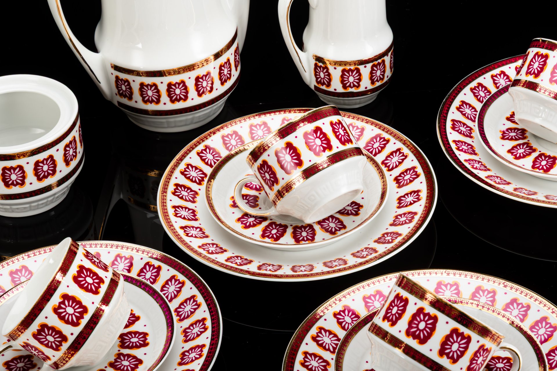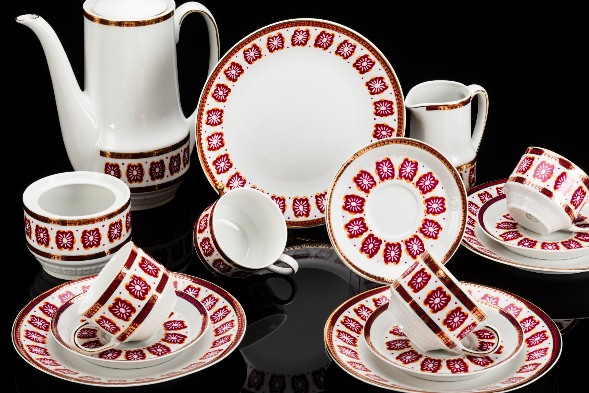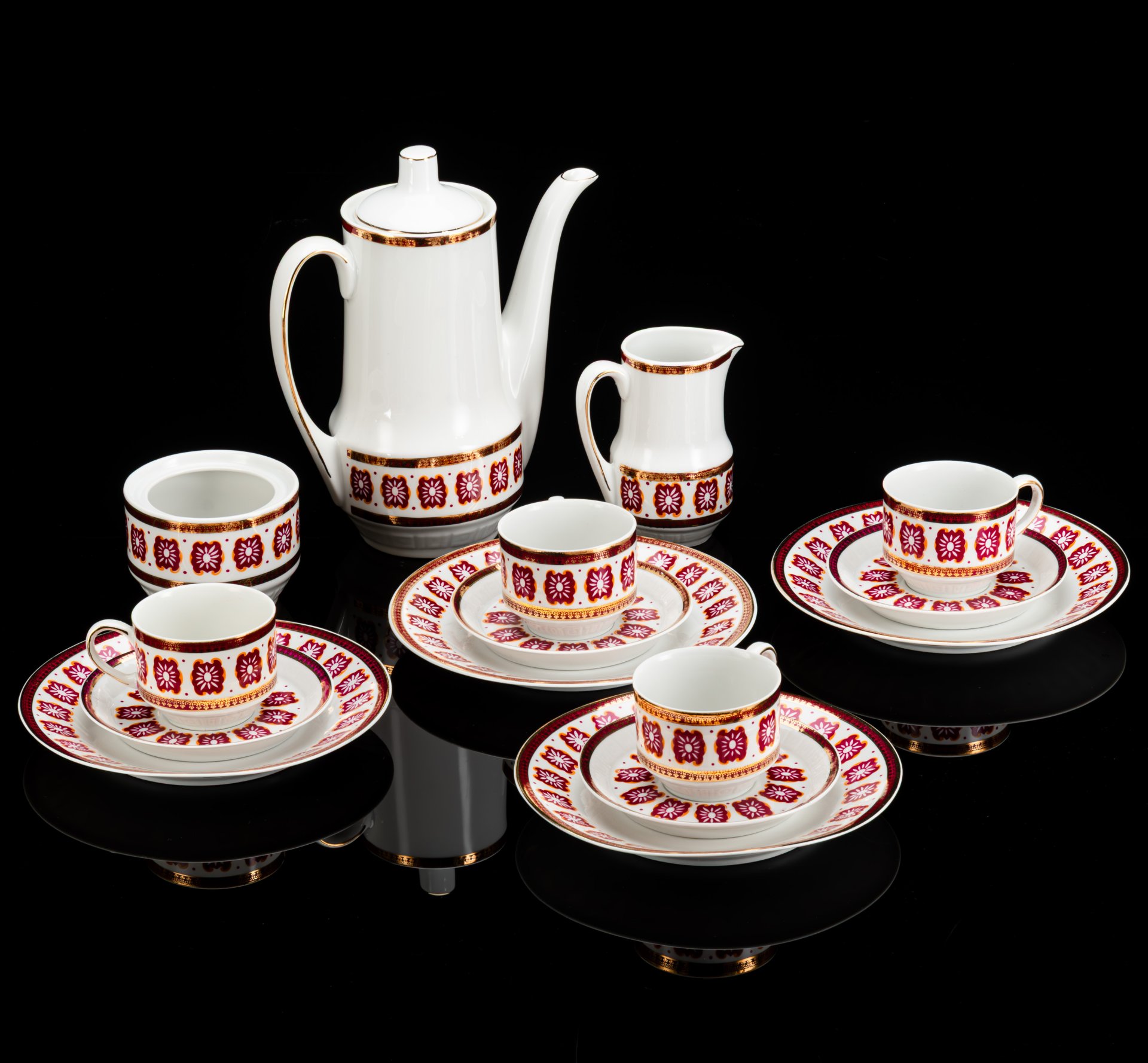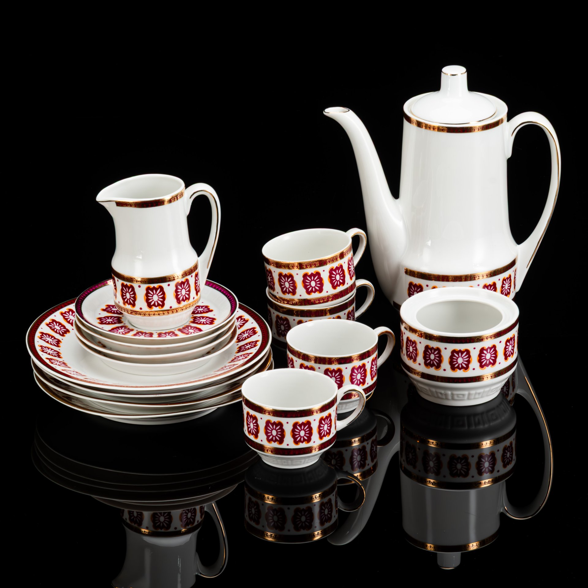 Сервиз кофейный c минималистичным геометрическим декором на 6 персон (15 предметов), фарфор, крытье, деколь, золочение, Freiberger Porzellan, ГДР, 1960-1990 гг.
