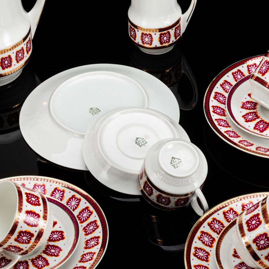 Сервиз кофейный "Гирлянда" на 6 персон (22 предмета), автор формы "Тюльпан" С.Е. Яковлева, автор рисунка Н.Б. Гусева, фарфор, деколь, золочение, Ленинградский фарфоровый завод (ЛФЗ), Российская Федерация, 1992-2001 гг.